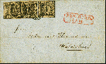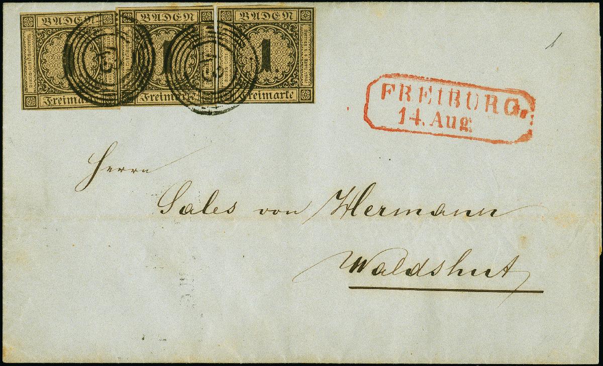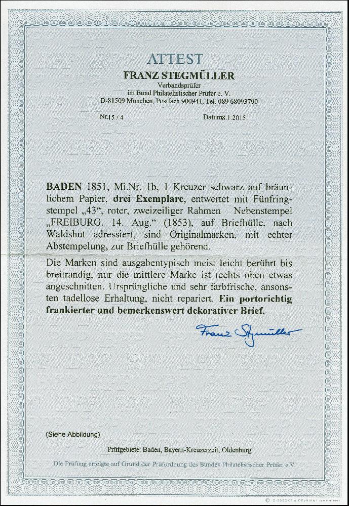 | Zusatzinformationen und Suchstichworte: | 383. Auktion Heinrich Köhler Auktionstermin 14.–15. & 18.–23. März 2024 Los 8002 Altdeutschland Baden 1 Kreuzer auf braun, 3 Einzelwerte als Streifen geklebt, die mittlere Marke rechts oben etwas angeschnitten, sonst guter Schnitt, mit zweimal klar aufgesetzter Nr. "43" und sauber nebengesetztem roten Ra.2 "FREIBURG 14 Aug." (1853) auf Briefhülle nach Waldshut. Schöne und sonst tadellose Erhaltung. Ein sehr attraktives Stück. Fotoattest Stegmüller BPP (2015) Ausruf 600,00 EUR |