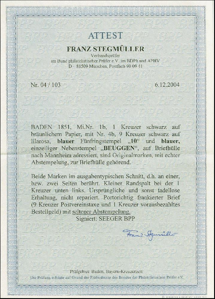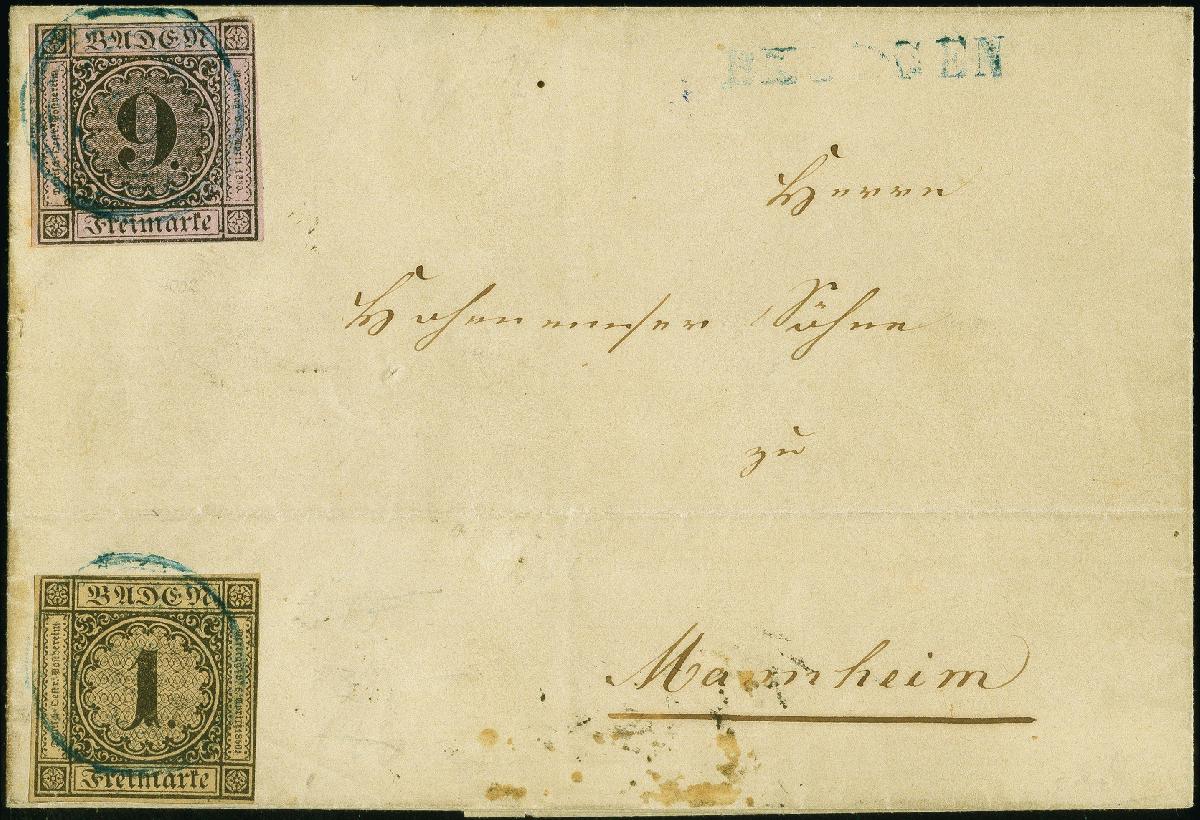 | Zusatzinformationen und Suchstichworte: | 383. Auktion Heinrich Köhler Auktionstermin 14.–15. & 18.–23. März 2024 Los 8005 Altdeutschland Baden 1 Kreuzer auf braun (kleiner Randspalt) und 9 Kreuzer auf lilarosa, mit leicht aufgesetzter blauer Nr. "10" und nebengesetztem L1 "BEUGGEN" auf Briefhülle nach Mannheim. Ursprüngliche und sonst tadellose Erhaltung. Eine außerordentlich seltene Frankaturkombination (wir haben nur 2 weitere registriert) und seltene Entwertung. Fotoattest Stegmüller BPP (2004) Ausruf 500,00 EUR |