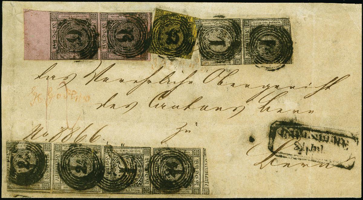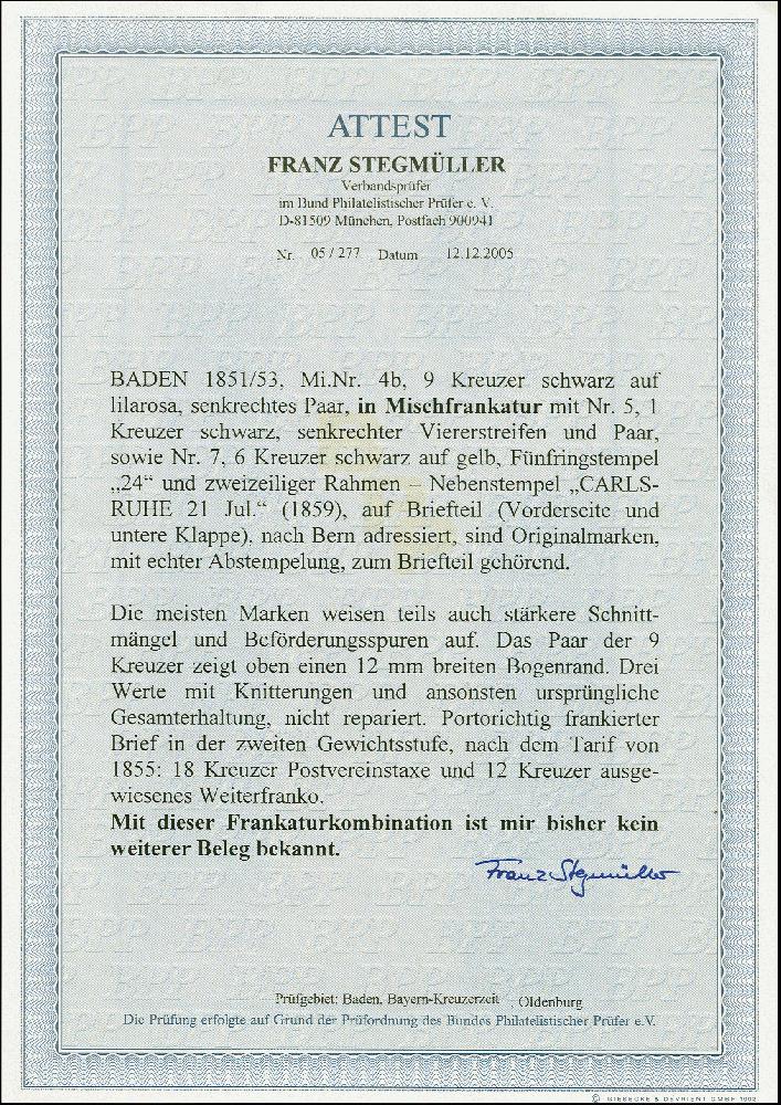 | Zusatzinformationen und Suchstichworte: | 383. Auktion Heinrich Köhler Auktionstermin 14.–15. & 18.–23. März 2024 Los 8017 Altdeutschland Baden 9 Kreuzer auf lila rosa im senkrechten Paar mit ca. 12 mm unteren Bogenrand, in Mischfrankatur mit 1853/54,1 Kreuzer schwarz, senkrechter Viererstreifen und Paar sowie Einzelstück 6 Kreuzer auf gelb, teils stärkere Schnittmängel, mit Nr. "24" und nebengesetztem Ra2 "CARLSRUHE 21 Jul." (1859) auf rückseitig nicht kompletter Briefhülle der 2.Gewichtsstufe nach Bern. Rückseitig Durchgangsstempel der badischen Bahnpost und von Basel sowie Ankunftsstempel. Beförderungsspuren, 3 Werte mit Knitterungen, sonst ursprüngliche Erhaltung. Eine einmalige Frankatur-Kombination. Fotoattest Stegmüller BPP (2005) Ausruf 1.000,00 EUR |