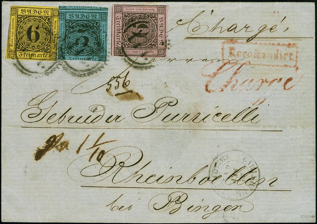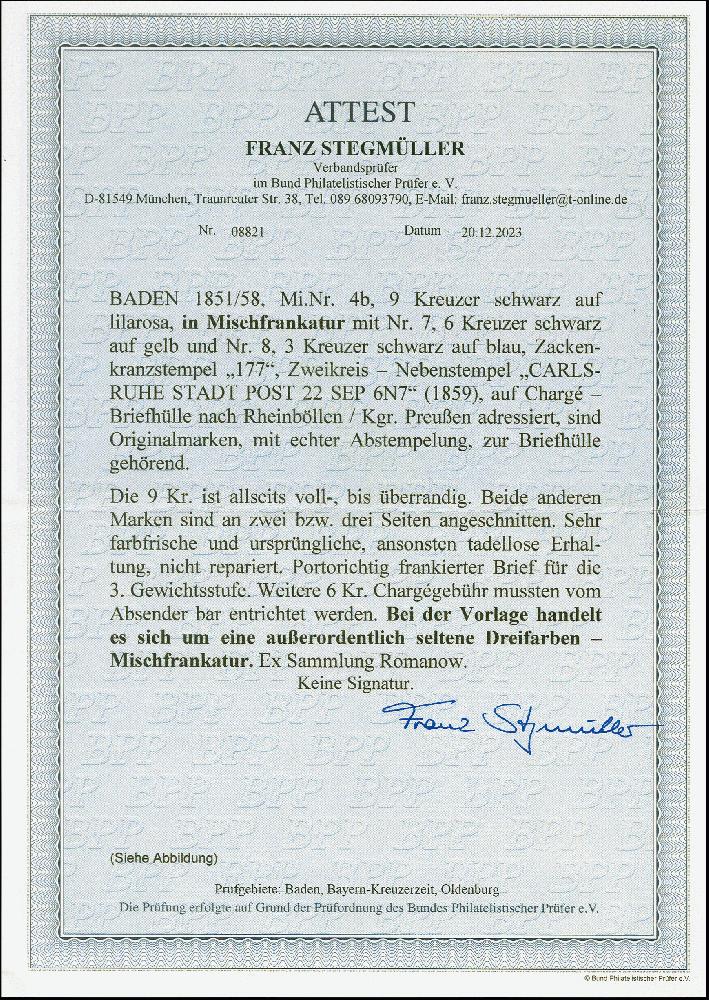 | Zusatzinformationen und Suchstichworte: | 383. Auktion Heinrich Köhler Auktionstermin 14.–15. & 18.–23. März 2024 Los 8018 Altdeutschland Baden 9 Kreuzer auf lilarosa, voll- bis überrandig, in Mischfrankatur mit 1853/54, 6 Kreuzer auf gelb und 1858, 3 Kreuzer auf blau, mit Zackenkranz "177" und nebengesetztem DKr. "CARLSRUHE STADT POST 22 SEP" (1859) auf Chargé -Briefhülle der 2.Gewichtsstufe mit rotem L1 "Chargé" und Zackenkranzstempel "Recomandirt", nach Rheinböllen bei Bingen. Sehr schöne und tadellose Erhaltung. Eine außerordentlich seltene Mischfrankatur über alle 3 Ausgaben. Fotoattest Stegmüller BPP (2023) Ausruf 2.000,00 EUR |