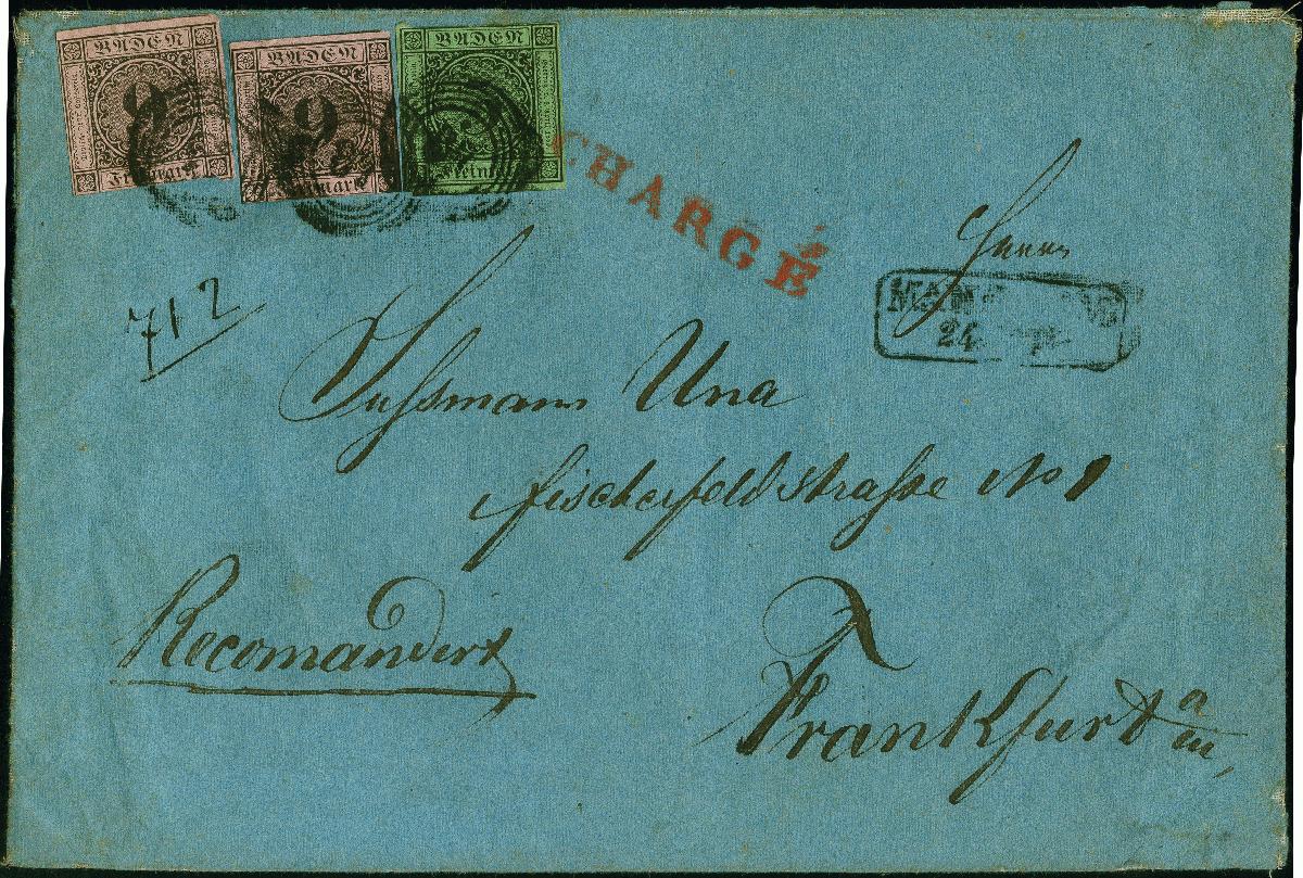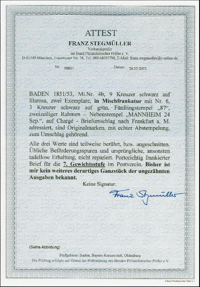 | Zusatzinformationen und Suchstichworte: | 383. Auktion Heinrich Köhler Auktionstermin 14.–15. & 18.–23. März 2024 Los 8019 Altdeutschland Baden 9 Kreuzer auf lilarosa, 2 Einzelwerte, in Mischfrankatur mit 3 Kreuzer auf grün, mit Nr. "87" und nebengesetztem Ra2 "MANNHEIM 24 Sep." auf eingeschriebenem blauen Leinenkuvert der 7. Gewichtsstufe, mit leicht auf die 3 Kreuzer übergehendem roten L1 "CHARGÉ" nach Frankfurt/Main. Übliche Beförderungspuren, sonst einwandfrei. Einzige bisher bekannte derartige Frankatur geschnittener Werte im Postverein, mit ohnehin außerordentlich seltener Frankaturkombination (nur noch zweimal auf Briefen nach England registriert). Fotoattest Stegmüller BPP (2023) Ausruf 1.000,00 EUR |