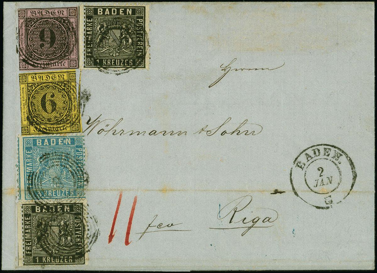 | Zusatzinformationen und Suchstichworte: | 383. Auktion Heinrich Köhler Auktionstermin 14.–15. & 18.–23. März 2024 Los 8020 Altdeutschland Baden 9 Kreuzer auf lilarosa in Mischfrankatur mit 1854, 6 Kreuzer auf gelb und gezähnter Ausgabe 1 Kreuzer schwarz (2 Einzelwerte) und 3 Kreuzer preußischblau, teils Schnittfehler bzw. ausgabetypisch gezähnt, alle farbfrisch, mit Nr. "8" und sauber nebengesetztem DKr. "BADEN 2 JAN" (1861) auf komplettem Faltbrief nach Riga. Durch die 3 Kreuzer verläuft ein leicht gebräunter waagrechter Briefbug, sonst ursprüngliche Bedarfserhaltung. Der Brief ist nach dem Tarif von 1860 portogerecht frankiert mit 9 Kreuzern Vereinsporto und 6 Kreuzern ausgewiesenem Weiterfranko. Eine einmalige Mischfrankatur mit für Baden sehr seltener Destination. Fotoattest Stegmüller BPP (2003) Ausruf 2.000,00 EUR |