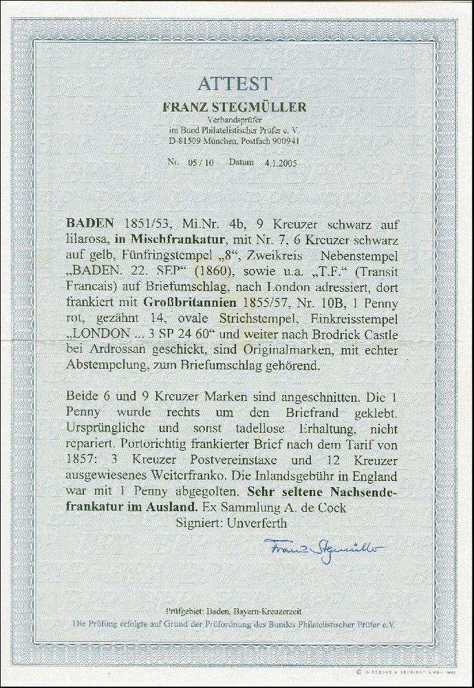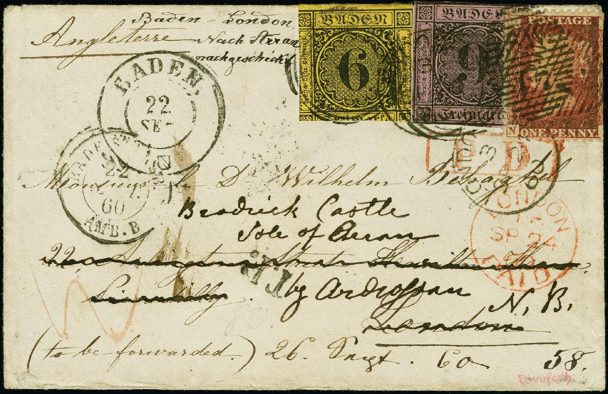 | Zusatzinformationen und Suchstichworte: | 383. Auktion Heinrich Köhler Auktionstermin 14.–15. & 18.–23. März 2024 Los 8024 Altdeutschland Baden 9 Kreuzer auf lilarosa in Mischfrankatur mit 1854,6 Kreuzer auf gelb, mit Nr. "8" und nebengesetztem DKr. "BADEN 22 SEP." (1860) auf Briefkuvert an Forwarding Agent in London; hier neu frankiert mit 1P. rot, und weitergesandt nach Brodick Castle, mit Transit- und Ankunftsstempeln. Die britische Frankatur rechts um den Rand des Kuverts geklebt, 6 Kreuzer Schnittmängel, sonst gute und ursprüngliche Erhaltung. Eine attraktive und in dieser Form einmalige Misch- und Nachsendefrankatur. Signiert Unverfehrt, Fotoattest Stegmüller BPP (2005) Ausruf 500,00 EUR |