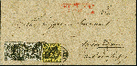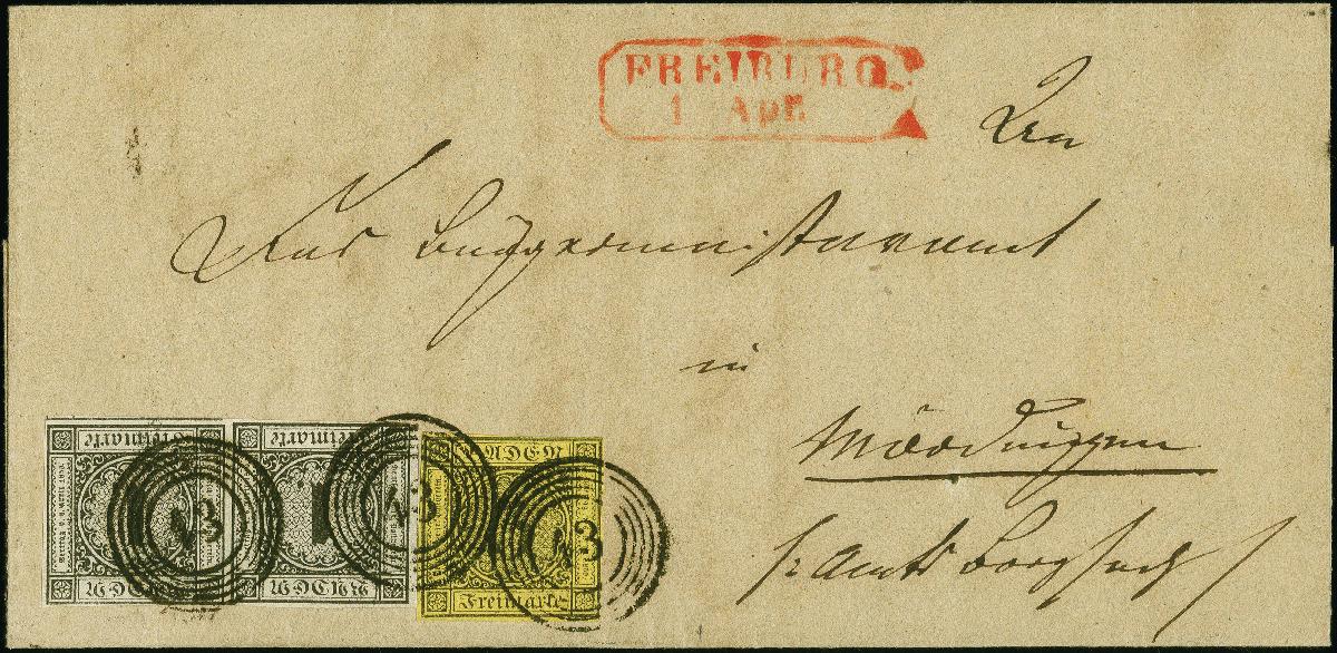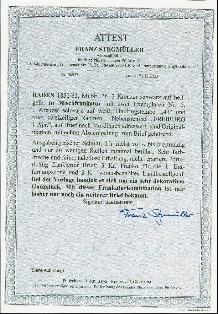 | Zusatzinformationen und Suchstichworte: | 383. Auktion Heinrich Köhler Auktionstermin 14.–15. & 18.–23. März 2024 Los 8025 Altdeutschland Baden 1 Kreuzer schwarz im waagerechten Paar, in Mischfrankatur mit 1851/52, 3 Kreuzer auf hellgelb, alle farbfrisch und meist voll- bis breitrandig, mit klar aufgesetzter Nr. "43" und nebengesetztem roten Ra2 "FREIBURG 1Apr." auf komplettem Faltbrief nach Merdingen im Landzustellbereich mit vorausbezahlten Bestellgeld. Sehr schöne und tadellose Erhaltung. Eine sehr seltene Kombination, die wir nur noch zweimal registriert haben. Signiert Seeger BPP und Fotoattest Stegmüller BPP (2023) Ausruf 1.500,00 EUR |
