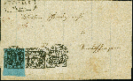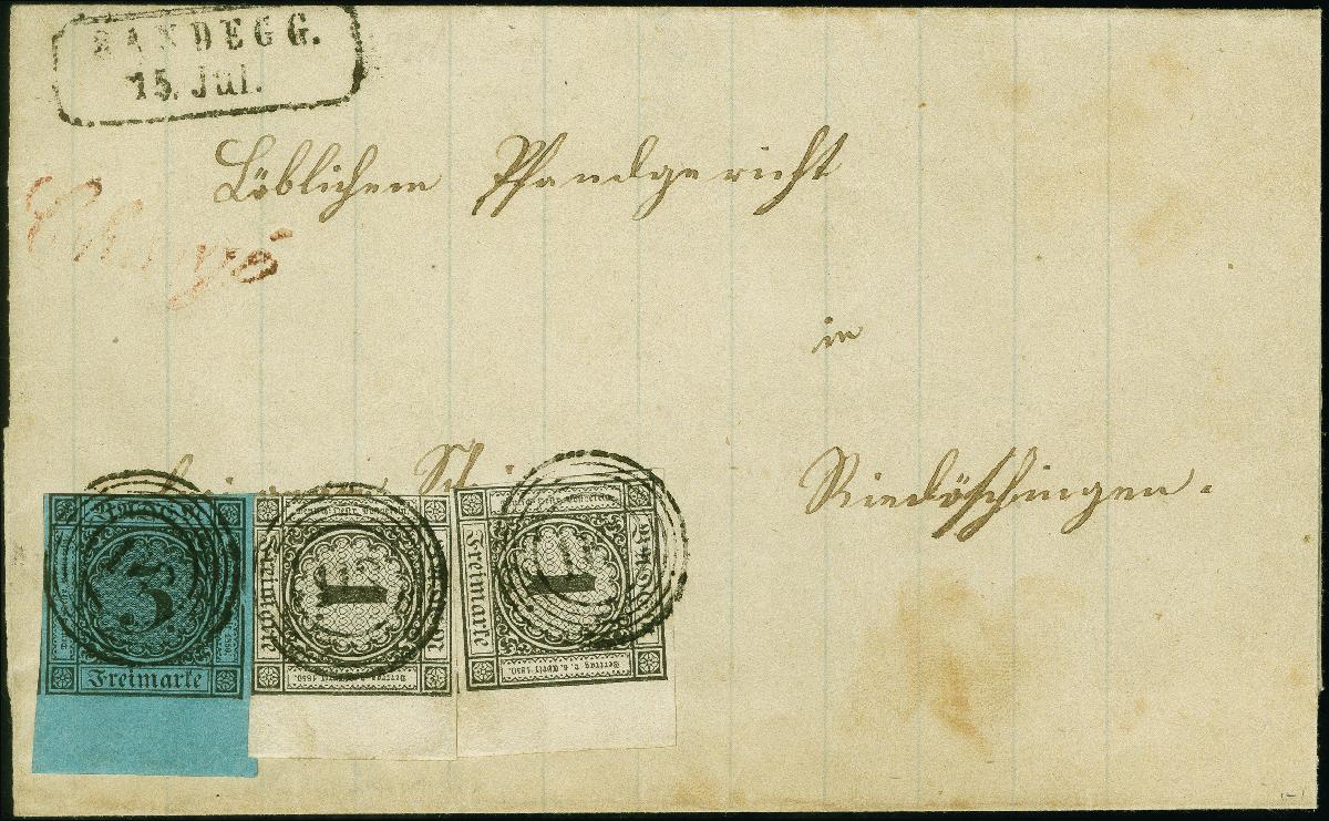 | Zusatzinformationen und Suchstichworte: | 383. Auktion Heinrich Köhler Auktionstermin 14.–15. & 18.–23. März 2024 Los 8026 Altdeutschland Baden 1 Kreuzer schwarz, 2 Einzelwerte mit jeweils 7 mm rechtem Bogenrand, davon eine voll- bis breitrandig, in Mischfrankatur mit 3 Kreuzer auf blau mit 8,5 mm unterem Bogenrand, oben leicht berührt, sonst voll- bis überrandig, mit jeweils leicht aufgesetzter Nr. "113" und nebengesetztem Ra2 "RANDEGG 15 Jul." auf Charge-Briefhülle (linke Klappe fehlt) nach Riedöschingen im Landbestellbezirk; 6 Kreuzer Chargé -Gebühr mussten vom Absender bar bezahlt werden. Eine seltene und sehr attraktive Mischfrankatur dreier Randstücke. Fotoattest Stegmüller BPP (2023) Ausruf 500,00 EUR |