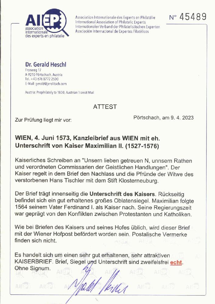 | Zusatzinformationen und Suchstichworte: | Viennafil 83. Live-Auktion 21. - 23. November 2023 Los 1077 Österreich Kaiserbriefe 1573, Brief vom 4.6. mit eigenhändiger Unterschrift Maximilian vom Kaiser Maximilian II. (1527-1576), kaiserliches Trockensiegel, ausführliches Attest Heschl Zuschlag 500,00 EUR |