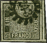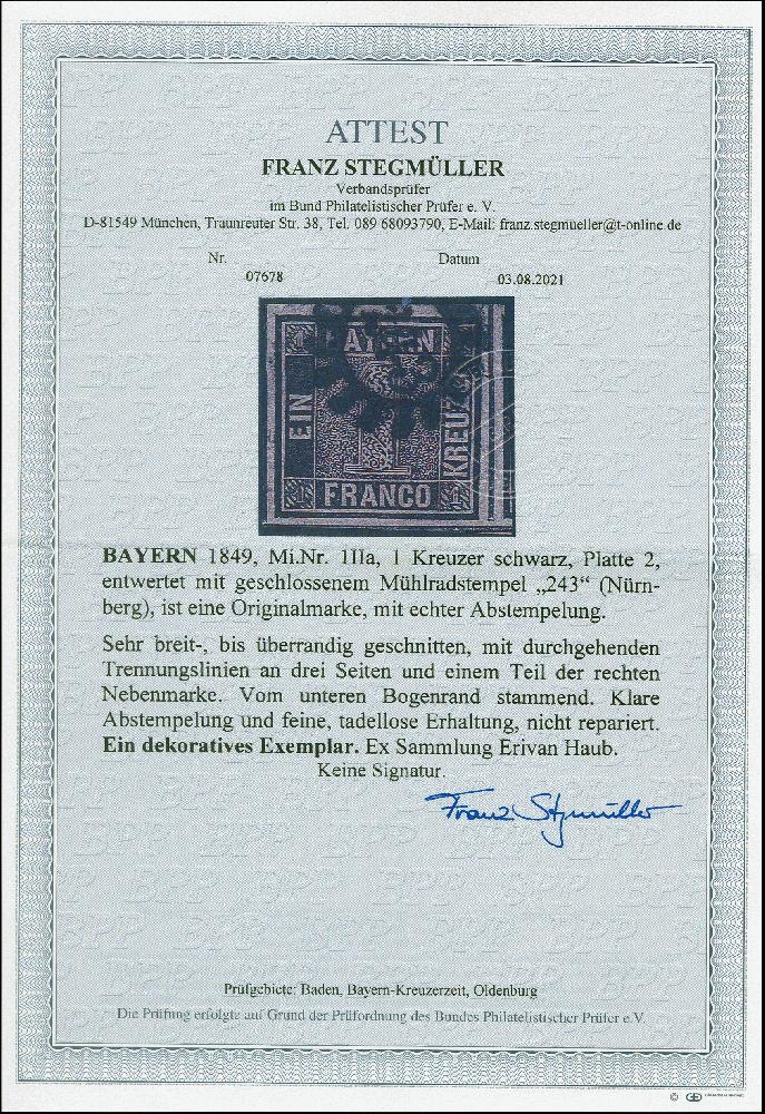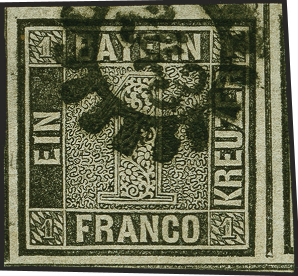 | Zusatzinformationen und Suchstichworte: | 383. Auktion Heinrich Köhler 14.–15. & 18.–23. März 2024 Los 4 Altdeutschland Bayern 1 Kreuzer schwarz, Platte 2, farbfrisch und allseits breitrandig, mit zumindest Teilen von 3 Trennungslinien und rechts Teil der Nachbarmarke, sauber entwertet durch gMR "243" NÜRNBERG. Tadellos. Fotoattest Stegmüller BPP (2021) Ausruf 1.000,00 EUR |