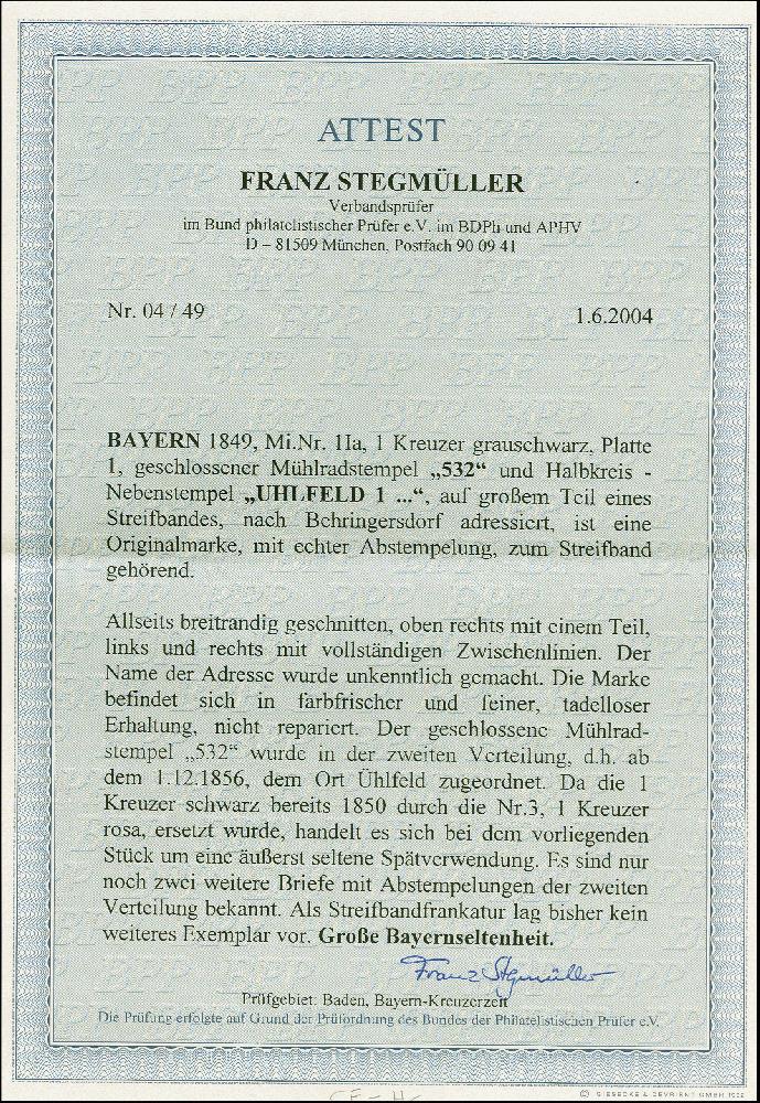 | Zusatzinformationen und Suchstichworte: | 383. Auktion Heinrich Köhler 14.–15. & 18.–23. März 2024 Los 5 Altdeutschland Bayern 1 Kreuzer schwarz, Platte 1, farbfrisch und allseits breitrandig, mit übergehend aufgesetztem gMR "532" und nebengesetztem Halbkreisstempel "UHLFELD 1…", auf rückseitig teils ergänztem Streifband nach Behringersdorf. Der Name in der Adresse radiert, sonst einwandfrei. Ein außerordentlich seltenes Stück; es sind nur 2 weitere Ganzstücke mit Abstempelung der 2. Verteilung auf der Nr. 1 bekannt. Fotoattest Stegmüller BPP (2004) Ausruf 8.000,00 EUR |