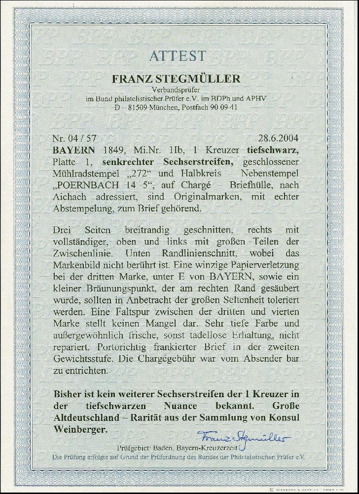 | Zusatzinformationen und Suchstichworte: | 383. Auktion Heinrich Köhler 14.–15. & 18.–23. März 2024 Los 8 Altdeutschland Bayern 1 Kreuzer tiefschwarz, Platte 1, senkrechter 6er-Streifen, die untere Marke unten lupen- bis vollrandig, sonst alle Werte breitrandig mit fast vollständigen Zwischenlinien, mit einzelnen aufgesetztem gMR "272" und nebengesetztem Halbkreis "POERNBACH 14 5" sowie Langstempel "Chargé" auf rekommandierter Briefhülle an das Bezirksgericht in Aichach. Winzige Papierverletzung bei der 3. Marke unter E von BAYERN sowie ein kleiner gesäuberter Bräunungspunkt am rechten Rand, sonst einwandfrei (leichte Vorfalt-Spur zwischen der 3. und 4. Marke sei ordnungshalber erwähnt). Einer der spektakulärsten Briefe Bayerns, größte bekannte Mehrfachfrankatur der Nr. 1 (es sind nur 2 weitere Sechserstreifen der Nr. 1 auf Brief registriert, beide in der a-Farbe, von denen einer seit 90 Jahren nicht mehr aufgetaucht ist) und größte bekannte gebrauchte Einheit der b-Farbe. Ein einmaliges Stück. Fotoattest Stegmüller BPP (2004) Ausruf 40.000,00 EUR |