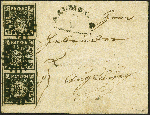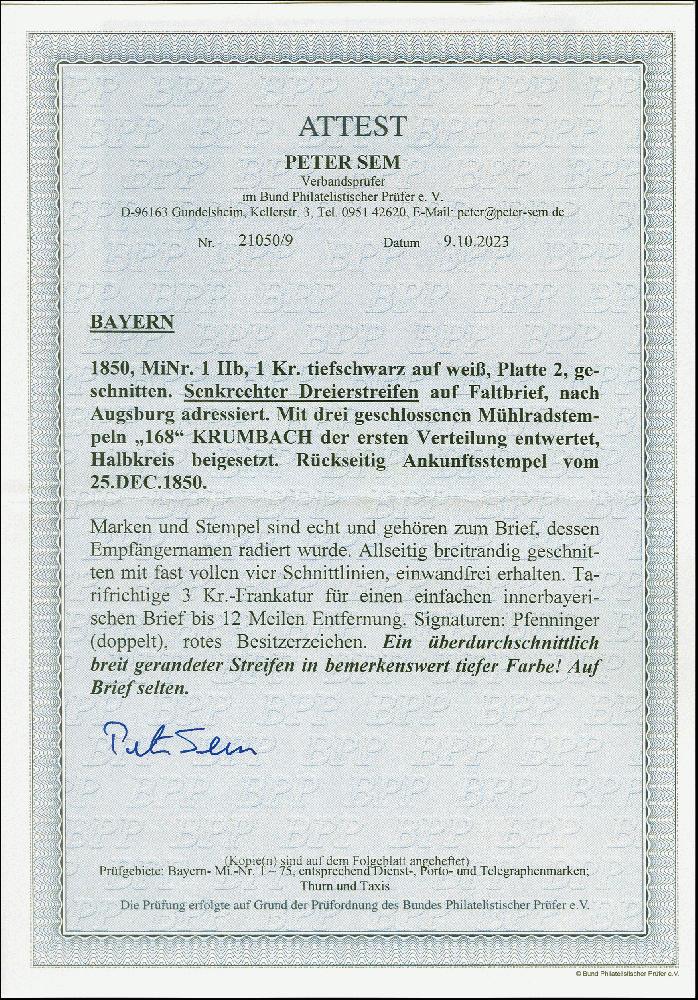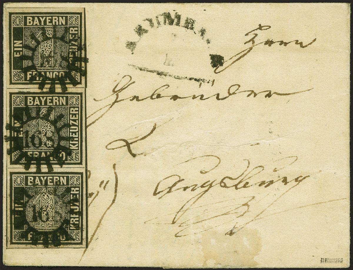 | Zusatzinformationen und Suchstichworte: | 383. Auktion Heinrich Köhler 14.–15. & 18.–23. März 2024 Los 11 Altdeutschland Bayern 1 Kreuzer tiefschwarz, Platte 2, senkrechter 3er-Streifen, allseits breitrandig mit fast vollständigen Trennungslinien, mit leicht aufgesetztem gMR "168" und leicht nebengesetztem Halbkreisstempel "KRUMBACH (25)/12" (1850) auf komplettem kleinen Faltbrief nach Augsburg. Der Name in der Adresse radiert, sonst einwandfrei (Kleine Vortrennschnitte außerhalb der Markenbilder). Ein attraktiver und äußerst seltener kleiner Brief mit einem besonders attraktiven Streifen der seltenen Farbe Ausruf 8.000,00 EUR |