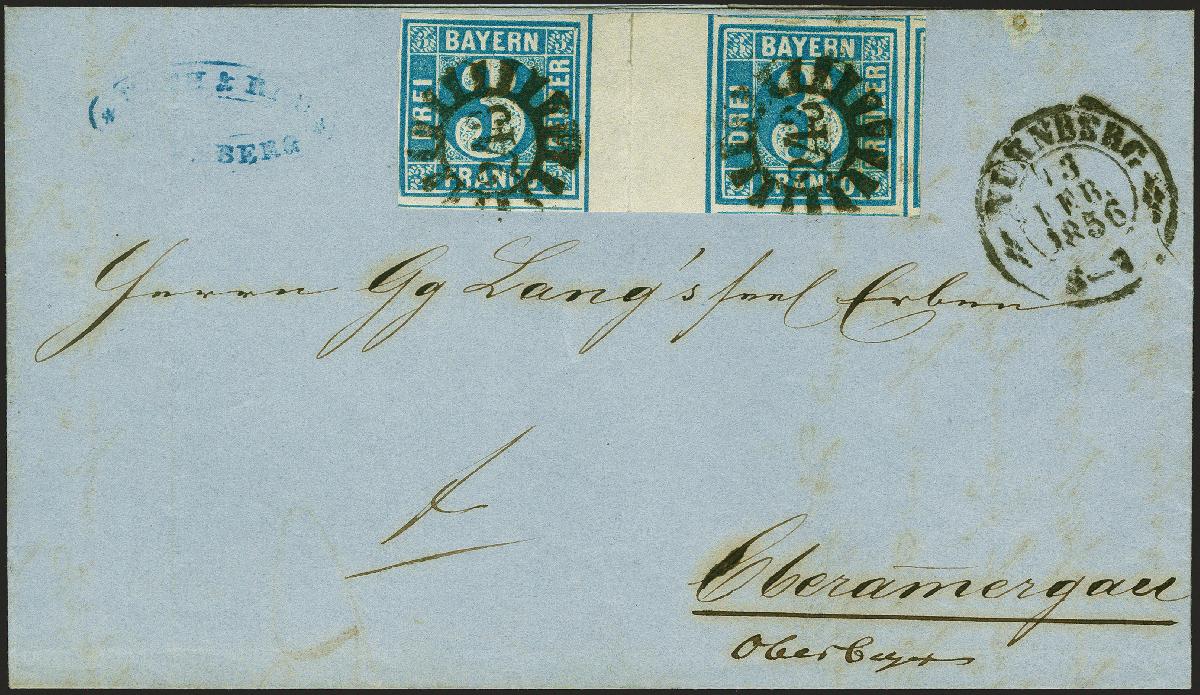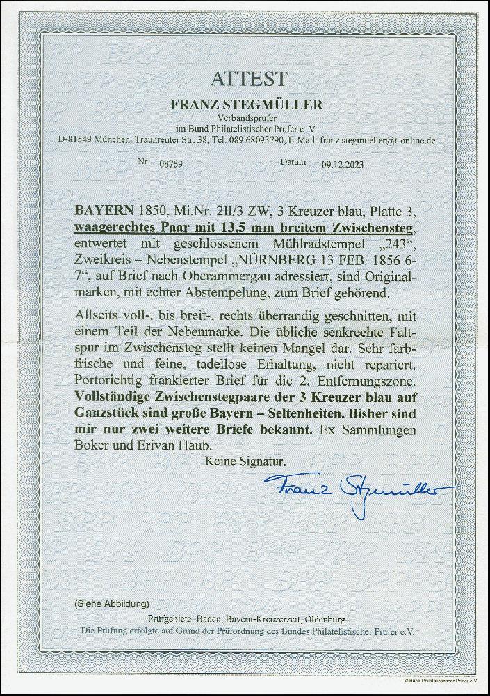 | Zusatzinformationen und Suchstichworte: | 383. Auktion Heinrich Köhler 14.–15. & 18.–23. März 2024 Los 21 Altdeutschland Bayern 3 Kreuzer blau, Platte 3, waagerechtes Zwischenstegpaar, sogenannte "Brücke", farbfrisch und voll- bis meist breitrandig, rechts mit Teil der Nachbarmarke, mit gMR "243" und sauber nebengesetztem Doppelkreisstempel "NÜRNBERG 13 FEB. 1856" auf komplettem Faltbrief nach Oberammergau. Schöne einwandfreie Erhaltung. Zwischenstegpaare auf Brief gehören zu den großen Seltenheiten der Bayern-Philatelie, von der 3 Kreuzer blau sind nur zwei weitere Briefe registriert, davon einer mit reparierter Frankatur. Ein spektakuläres Stück. Fotoattest Stegmüller BPP (2023). Ausruf 15.000,00 EUR |