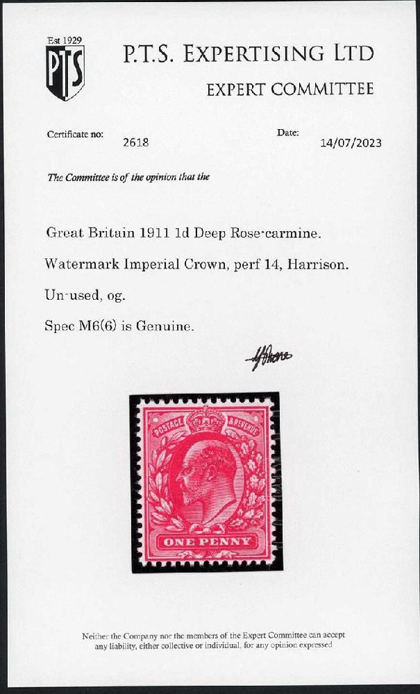 | Zusatzinformationen und Suchstichworte: | David Feldman S.A. - Great Britain and Commonwealth 29. Februar 2024 Los 1099 Grossbritannien König Eduard VII 1d Deep Rose-carmine, Harrison Perf 14, Superb Colour mint NH. PTS Cert. SG Spec M6(6) Ausruf 200,00 GBP |