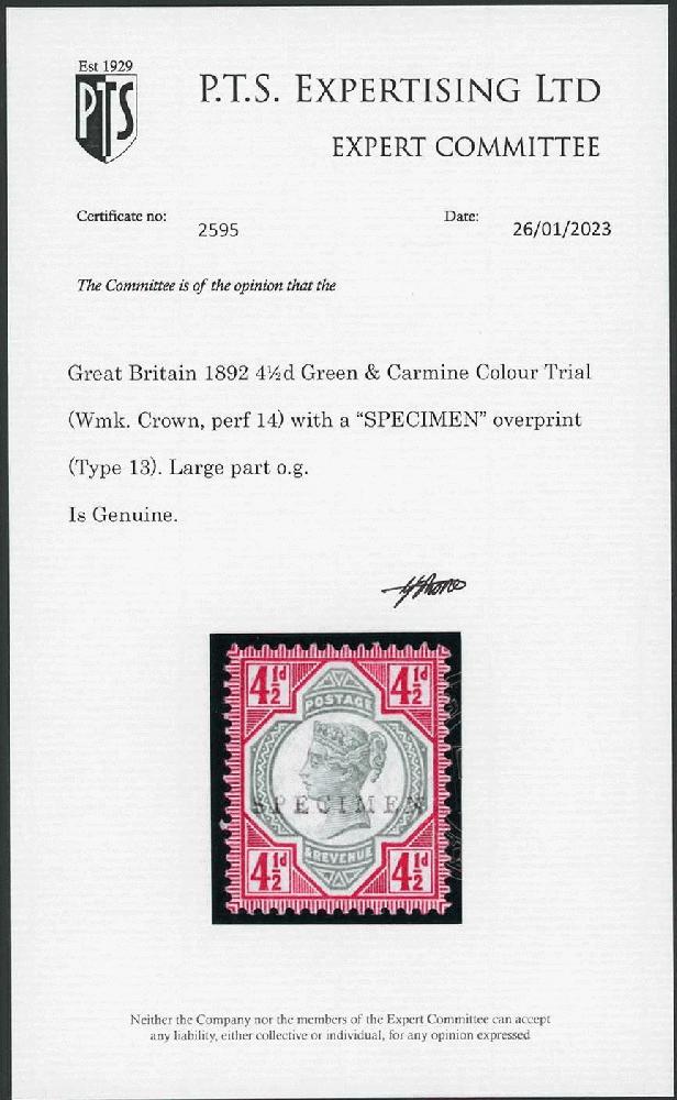 | Zusatzinformationen und Suchstichworte: | David Feldman S.A. - Great Britain and Commonwealth 29. Februar 2024 Los 1087 Grossbritannien 1855-1900 Ausgaben 4 1/2d Green and Carmine Colour Trial opt SPECIMEN, Type 13, Superb M/M, The colour trials were overprinted Specimen type 13 (the issued stamps were overprinted Specimen type 9). Cat £4500. Cert PTS Ausruf 950,00 GBP |