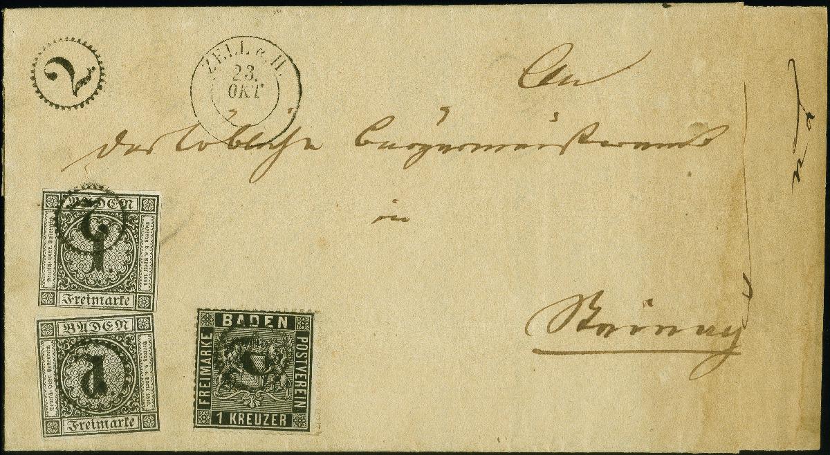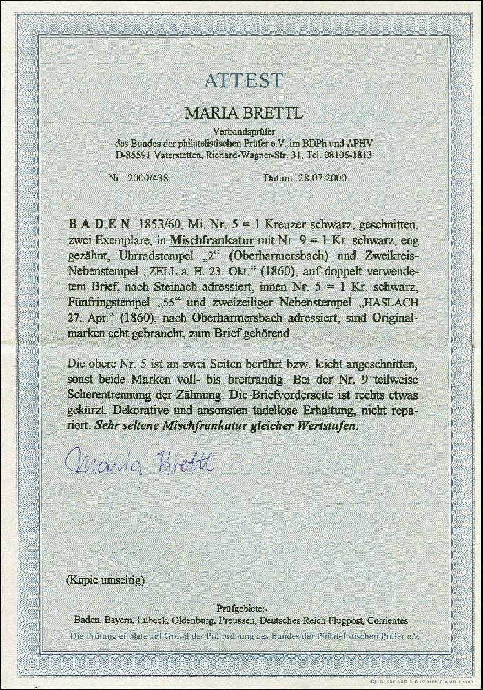| Zusatzinformationen und Suchstichworte: | 383. Auktion Heinrich Köhler Auktionstermin 14.–15. & 18.–23. März 2024 Los 8034 Altdeutschland Baden 1 Kreuzer schwarz, 2 Einzelwerte, davon eine voll-bis breitrandig, in wertstufengleich ja Mischfrankatur mit 1860,1 Kreuzer schwarz (teils Scherentrennung), alle mit alleiniger Entwertung durch sauber auf- und nebengesetztem Uhrradstempel "2" (Oberhamersbach) und klar nebengesetztem DKr. "ZELL a. H. 23 OKT." (1860) auf doppelt verwendeter Briefhülle (innen frankiert mit Mi. 5) nach Steinach. Die Hülle rechts etwas unfrisch, sonst einwandfrei. Eine attraktive und sehr seltene Mischfrankatur; wir haben nur 2 weitere registriert. Fotoattest Brettl BPP (2000) Ausruf 1.000,00 EUR |