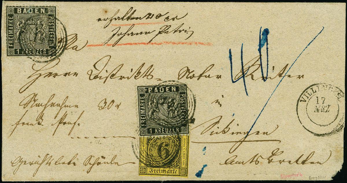 | Zusatzinformationen und Suchstichworte: | 383. Auktion Heinrich Köhler Auktionstermin 14.–15. & 18.–23. März 2024 Los 8039 Altdeutschland Baden 6 Kreuzer auf gelb in Mischfrankatur mit 2 Einzelwerten 1860/62, 1 Kreuzer schwarz, mit Nr. "148" auf Nachnahme-Briefhülle (ohne Seitenklappen) von "VILLINGEN 17 MRZ." nach Sickingen im Landbestellbezirk von Bretten. Die Frankatur entsprach 6 Kr. Porto + 1 Kr. Bestellgeld + 1 Kr. Landposttaxe, 2 Kr. Nachnahmeprovision wurden bar verrechnet (entsprechende Nachtaxe von "40" Kreuzern einschließlich 30 Kreuzer Nachnahmebetrag). Eine sehr seltene und attraktive Frankaturkombination, es ist nur eine weitere registriert. Signiert Seeger BPP, Georg Bühler und Unverferth, Fotoattest Stegmüller BPP (2023) Ausruf 1.500,00 EUR |