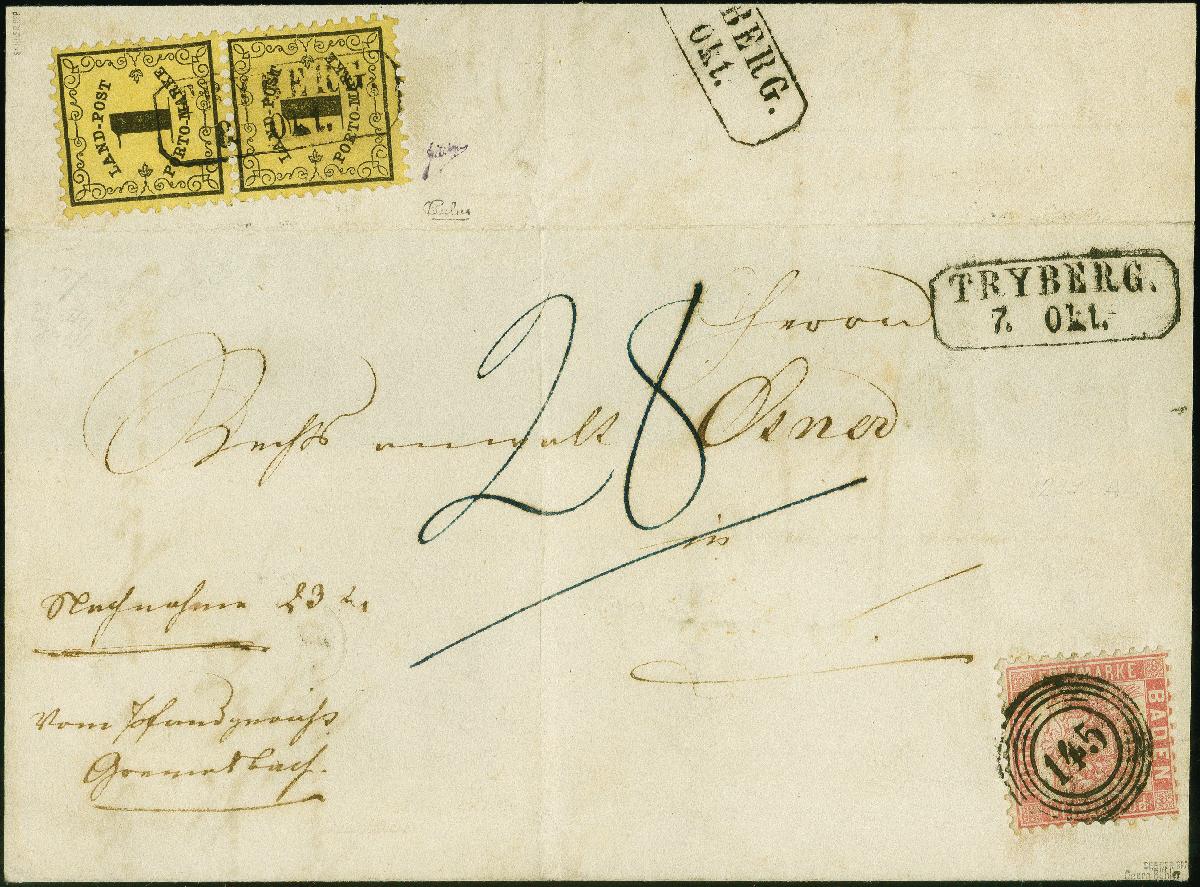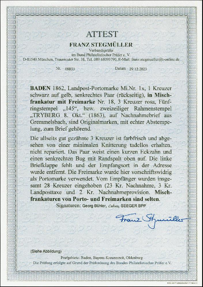 | Zusatzinformationen und Suchstichworte: | 383. Auktion Heinrich Köhler Auktionstermin 14.–15. & 18.–23. März 2024 Los 8055 Altdeutschland Baden 1 Kreuzer auf gelb im senkrechten Paar, mit Ra2 "TRYBERG 7. Okt." rückseitig auf Nachnahme-Faltbrief (Inhalt komplett, eine Seitenklappe fehlend) mit vorderseitiger Freimarke 1862/66, 3 Kreuzer rosa, mit klarer Nr."145", hier vorschriftswidrig als Portomarke verwendet. Die 3 kreuzer abgesehen von einer minimalen Knitterung tadellos; das Paar kurzer Zahn und unauffällige Bugspur mit kleinem Randspalt, der Empfangsort radiert. Eine attraktive und außerordentlich seltene Mischfrankatur. Signiert Bühler, Calves und Seeger BPP, Fotoattest Stegmüller BPP (2023) Ausruf 2.000,00 EUR |