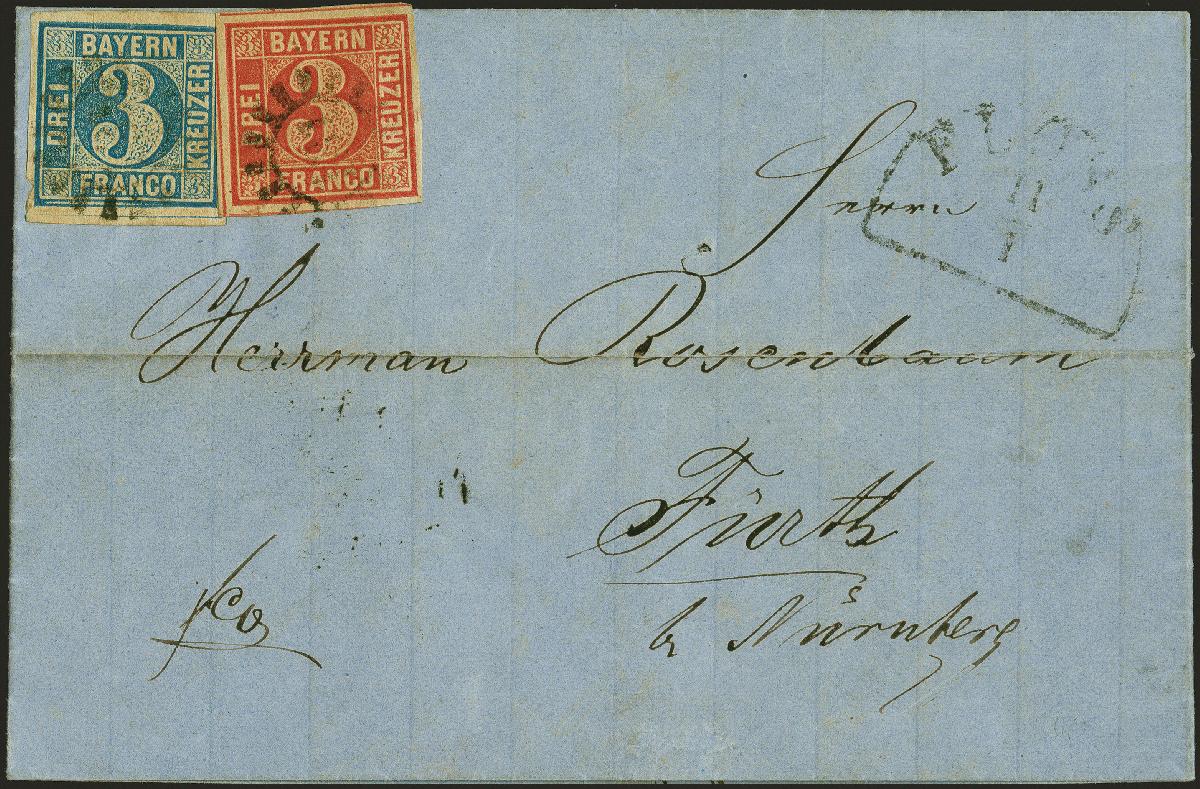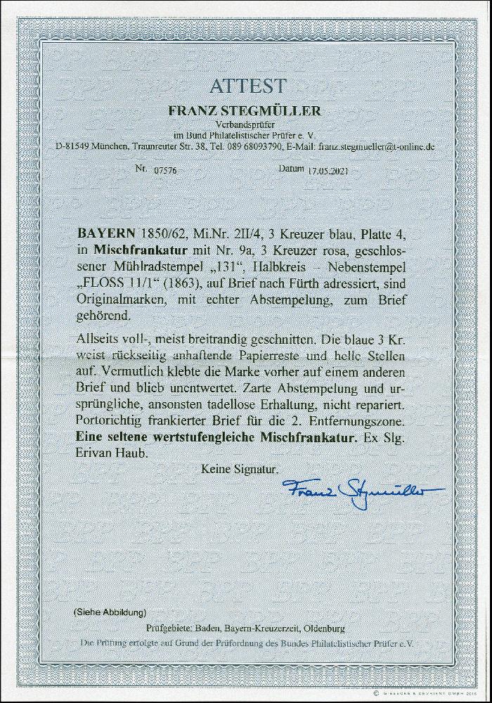 | Zusatzinformationen und Suchstichworte: | 383. Auktion Heinrich Köhler 14.–15. & 18.–23. März 2024 Los 24 Altdeutschland Bayern 3 Kreuzer blau, Platte 4 in wertstufengleicher Mischfrankatur mit 1862, 3 Kreuzer rosa, beide voll-bis meist breitrandig, breitrandig, mit gMR "131" und nebengesetztem Halbkreis "FLOSS 11/1" (1863) auf komplettem Faltbrief nach Fürth. Die blaue Marke rückseitig anhaftende Papierreste und helle Stellen, vermutlich unentwertet von einem anderen Brief abgelöst und hier noch einmal verwendet. Eine attraktive und seltene Frankatur in ansonsten einwandfreier Erhaltung; wir haben nur 4 weitere Briefe mit dieser Kombination registriert. Fotoattest Stegmüller BPP (2021) Ausruf 800,00 EUR |