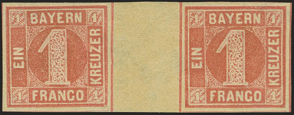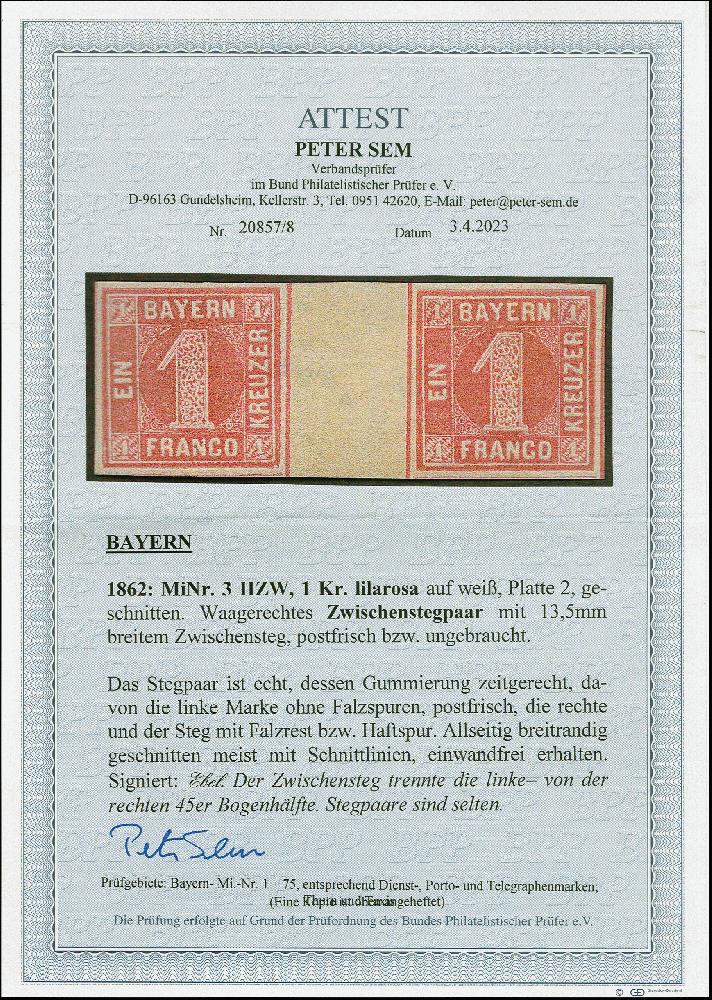 | Zusatzinformationen und Suchstichworte: | 383. Auktion Heinrich Köhler 14.–15. & 18.–23. März 2024 Los 25 Altdeutschland Bayern 1 Kreuzer rosa, Platte 2, waagerechtes Zwischenstegpaar, farbfrisch und allseits breitrandig, ungebraucht mit Originalgummi. Tadellos. Signiert Ebel und Fotoattest Sem BPP (2023) Ausruf 1.000,00 EUR |
