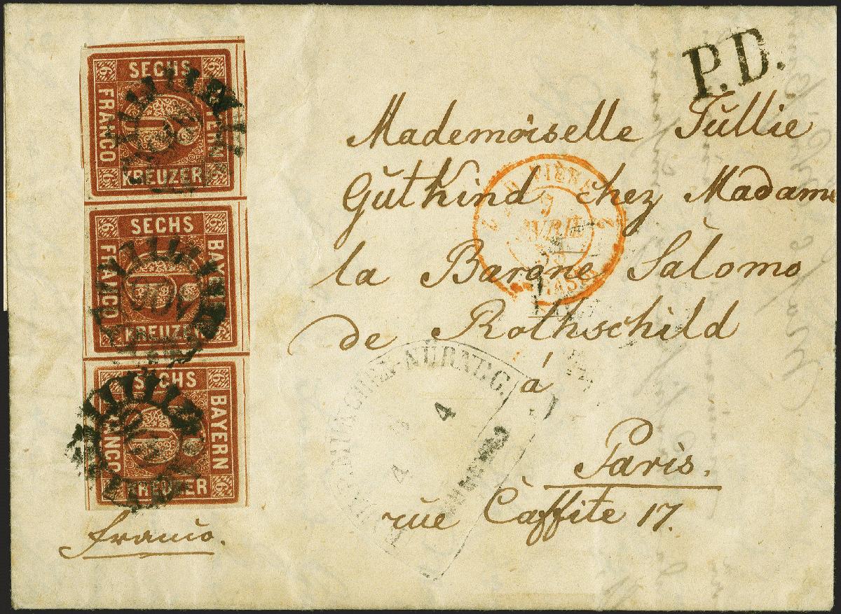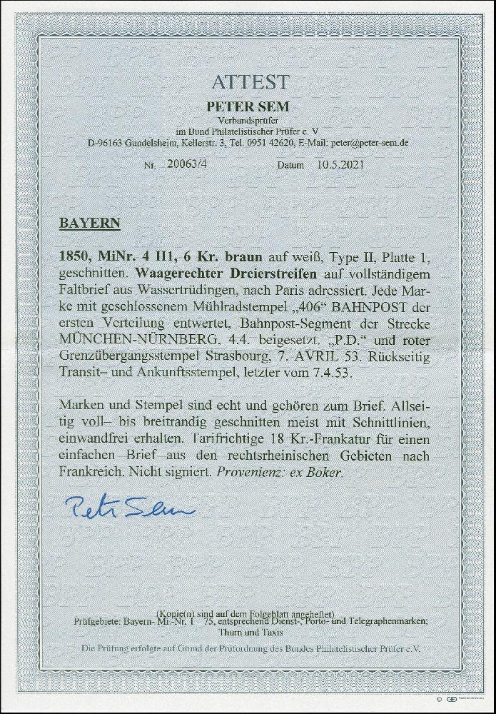 | Zusatzinformationen und Suchstichworte: | 383. Auktion Heinrich Köhler 14.–15. & 18.–23. März 2024 Los 29 Altdeutschland Bayern 6 Kreuzer braun im waagerechten 3er-Streifen, allseits breit- bis überrandig, mit gMR "406" und nebengesetztem Segmentstempel "BAHNP. MÜNCHEN-NÜRNBERG 4 4" (1853) auf komplettem Faltbrief mit Inhalt von Wassertrüdingen, an die Adresse Baronin Salomon de Rothschild, Paris. Ein attraktiver Auslandsbrief in einwandfreier Erhaltung. Fotoattest Sem BPP (2021) Ausruf 500,00 EUR |