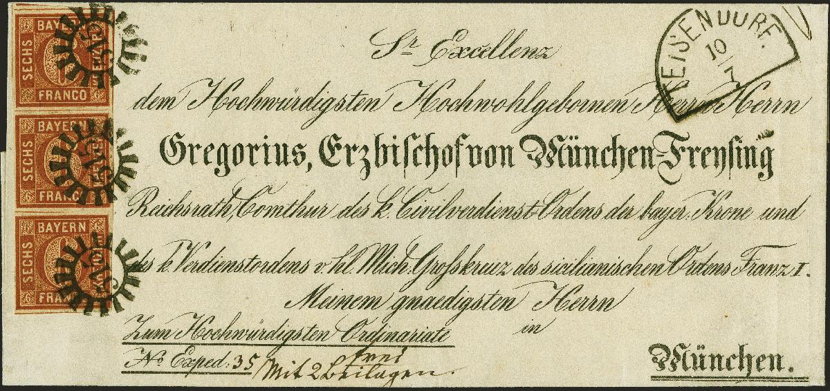 | Zusatzinformationen und Suchstichworte: | 383. Auktion Heinrich Köhler 14.–15. & 18.–23. März 2024 Los 30 Altdeutschland Bayern 6 Kreuzer rotbraun im senkrechten 3er-Streifen, voll- bis breitrandig und in frischer, kräftiger Farbe, mit jeweils sauber übergehend aufgesetztem gMR "515" und klar nebengesetztem Halbkreisstempel "TEISENDORF 10/7" (1861) auf Bischofsbrief-Hülle der 3. Gewichtsstufe an Gregorius in München; ein phantastisch schöner und außerordentlich seltener Brief. Fotoattest Sem BPP (2023) Ausruf 1.000,00 EUR |