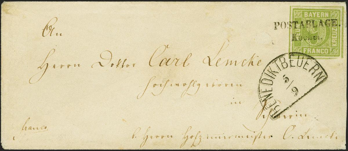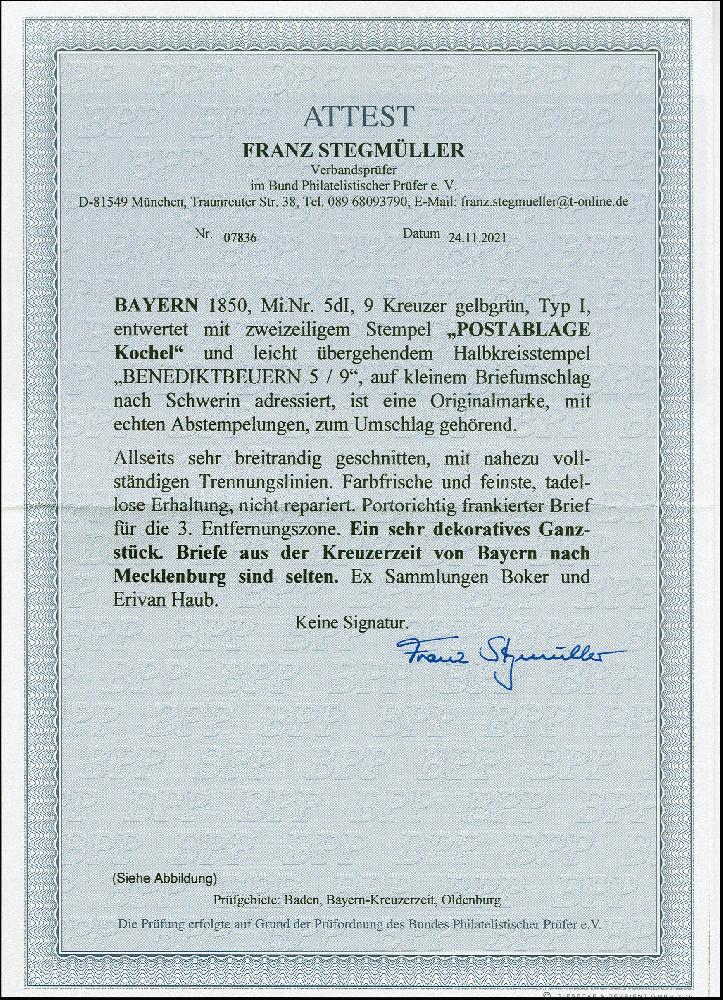 | Zusatzinformationen und Suchstichworte: | 383. Auktion Heinrich Köhler 14.–15. & 18.–23. März 2024 Los 37 Altdeutschland Bayern 9 Kreuzer gelbgrün, Type I, farbfrisch und allseits sehr breitrandig, mit nahezu vollständigen Zwischenlinien, mit Langstempel "POSTABLAGE Kochel" sowie übergehendem Halbkreisstempel "BENEDIKTBEUERN 5/9" auf kleinem Briefkuvert nach Schwerin in Mecklenburg. Ein attraktiver kleiner Brief in einwandfreier Erhaltung. Fotoattest Stegmüller BPP (2021) Ausruf 150,00 EUR |