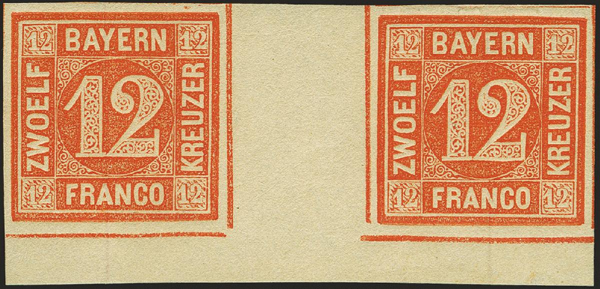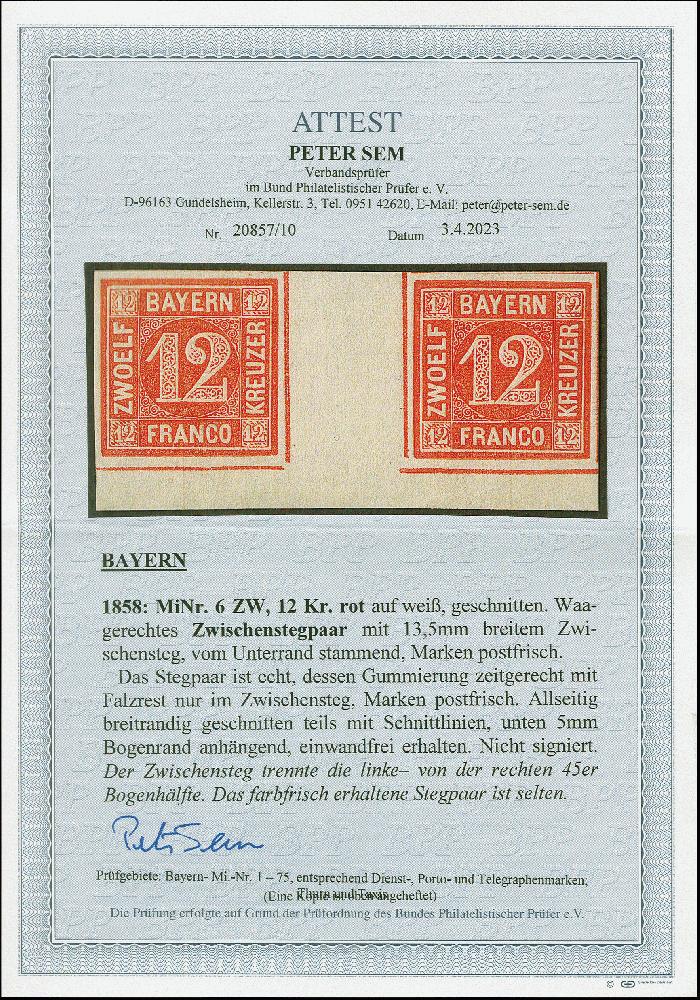| Zusatzinformationen und Suchstichworte: | 383. Auktion Heinrich Köhler 14.–15. & 18.–23. März 2024 Los 41 Altdeutschland Bayern 12 Kreuzer rot, waagerechtes Zwischenstegpaar, farbfrisch und allseits breitrandig, unten mit ca. 4 mm Bogenrand, ungebraucht mit Originalgummi, die Marken postfrisch. Tadellos. Fotoattest Sem BPP (2023) Ausruf 1.500,00 EUR |