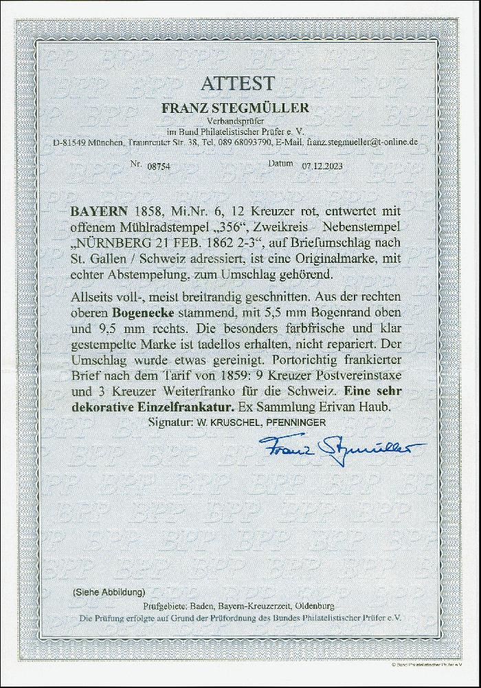 | Zusatzinformationen und Suchstichworte: | 383. Auktion Heinrich Köhler 14.–15. & 18.–23. März 2024 Los 42 Altdeutschland Bayern 12 Kreuzer rot, farbfrische und voll- bis meist breitrandige rechte obere Bogenecke mit ca. 5,5/9,5 mm Bogenrändern, mit klar aufgesetztem oMR "356" und nebengesetztem Doppelkreisstempel "NÜRNBERG 21 FEB 1862" auf Briefkuvert nach St. Gallen. Das Kuvert etwas gereinigt und außerhalb der Frankatur waagerecht gefaltet, sonst tadellos. Eine sehr attraktive und in dieser Form sehr seltene Einzelfrankatur. Signiert Kruschel und Pfenninger, Fotoattest Stegmüller BPP (2023) Ausruf 500,00 EUR |