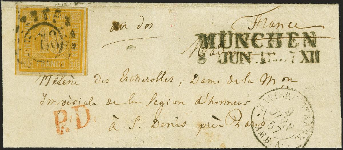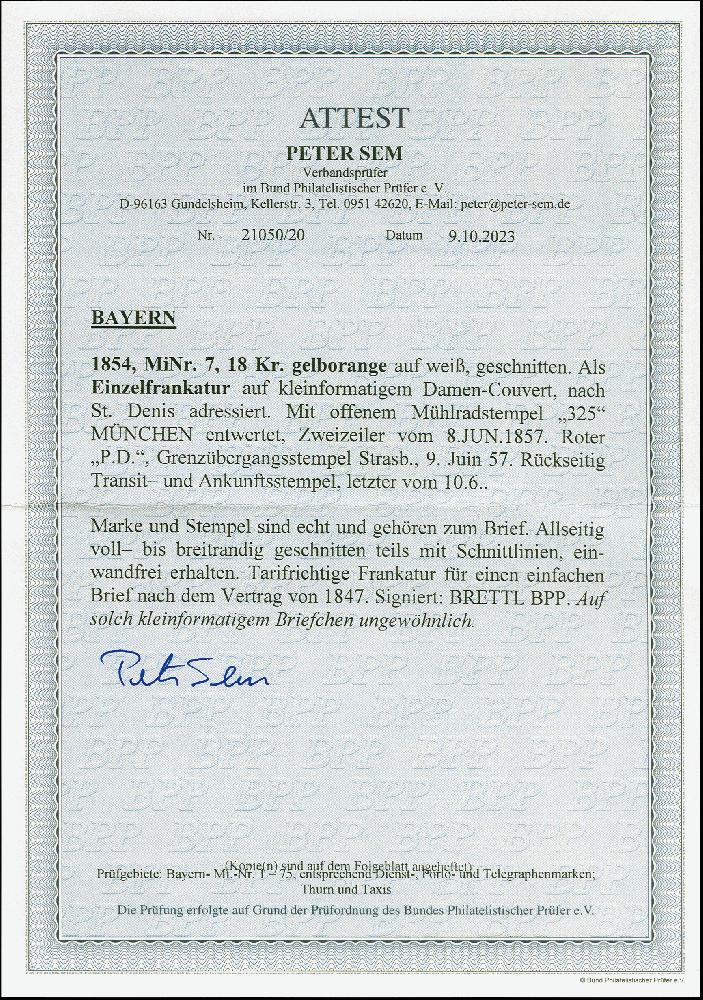 | Zusatzinformationen und Suchstichworte: | 383. Auktion Heinrich Köhler 14.–15. & 18.–23. März 2024 Los 43 Altdeutschland Bayern 18 Kreuzer gelborange, farbfrisch und allseits breitrandig, mit uMR 325 und sauber nebengesetztem Langstempel München 8JUN 1857 auf Mini-Briefkuvert nach St. Denis bei Paris, mit Transit- und Ankunftsstempeln. Ein ungewöhnliches Stück in einwandfreier Erhaltung. Signiert Brettl BPP und Fotoattest Sem BPP (2023) Ausruf 800,00 EUR |