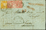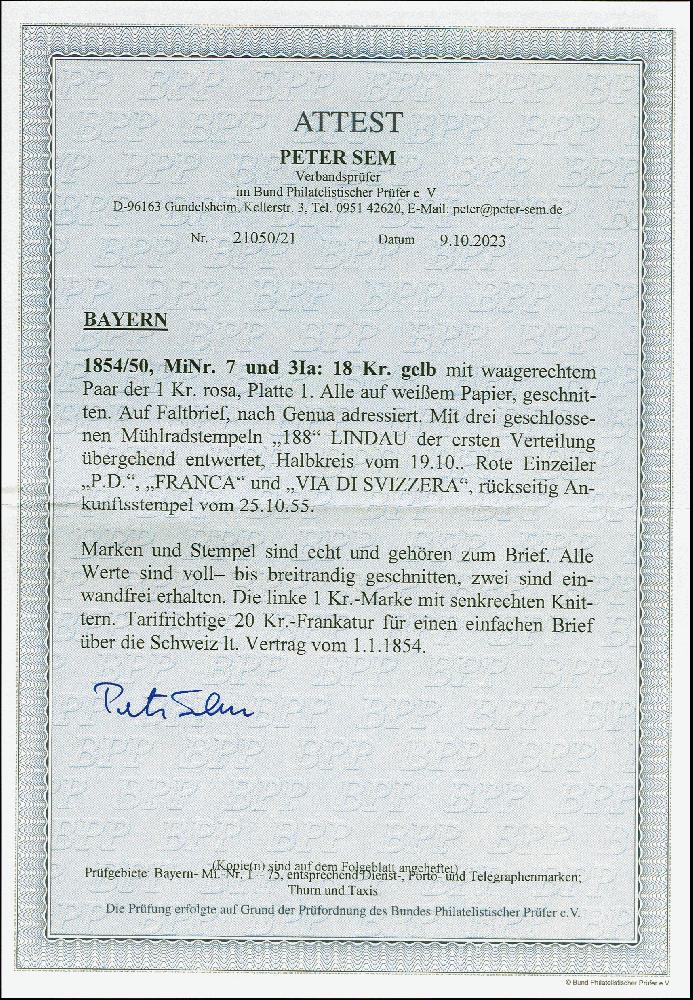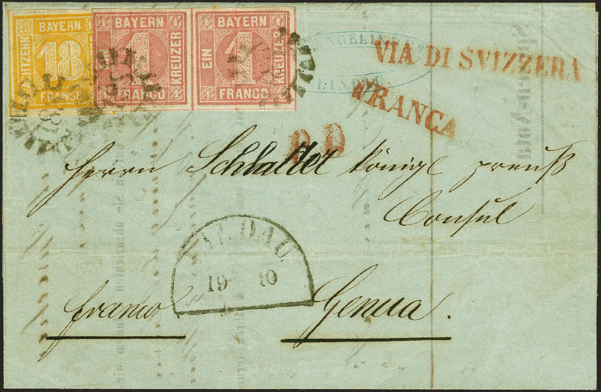 | Zusatzinformationen und Suchstichworte: | 383. Auktion Heinrich Köhler 14.–15. & 18.–23. März 2024 Los 47 Altdeutschland Bayern 18 Kreuzer gelblichorange und waagerechtes Paar 1 Kreuzer rosa, alle farbfrisch und voll- bis breitrandig, mit gMR "188" und nebengesetztem Aufgabestempel "LINDAU 19 10" (1855) auf komplettem Faltbrief (Frachtrechnung) über die Schweiz nach Genua, Königreich Sardinien, mit rotem "VIA DI SVIZZERA". Die linke 1 Kreuzer-Marke leichte senkrechte Knitter, der Name in der Anschrift abgeändert, sonst tadellose und frische Erhaltung. Ein attraktiver und seltener Auslandsbrief Ausruf 1.000,00 EUR |