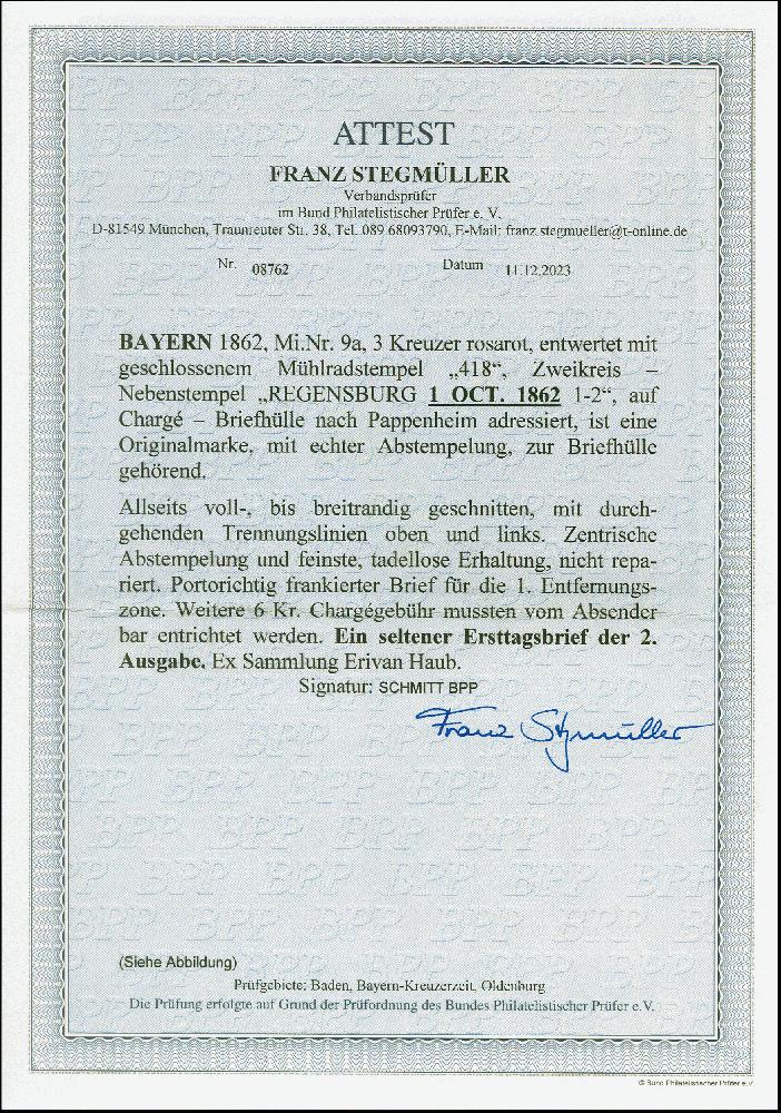 | Zusatzinformationen und Suchstichworte: | 383. Auktion Heinrich Köhler 14.–15. & 18.–23. März 2024 Los 49 Altdeutschland Bayern 3 Kreuzer rosarot, farbfrisch und allseits breitrandig, mit klar und zentrisch aufgesetztem gMR "418" und sauber nebengesetztem Doppelkreisstempel "REGENSBURG 1OCT. 1862" auf eingeschriebener Briefhülle mit Rötelgitter und nebengesetztem L1 "CHARGE" nach Pappenheim. Sehr schöne und einwandfreie Erhaltung. Wir haben nur 3 Ersttagsbriefe dieser Marke registriert, davon ist dieser zweifellos der attraktivste und der einzige Chargé-Brief. Signiert Schmitt BPP und Fotoattest Stegmüller BPP (2023) Ausruf 2.000,00 EUR |