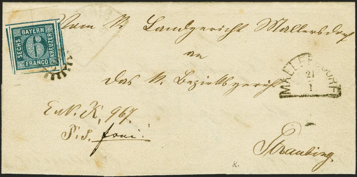 | Zusatzinformationen und Suchstichworte: | 383. Auktion Heinrich Köhler 14.–15. & 18.–23. März 2024 Los 56 Altdeutschland Bayern 6 Kreuzer blau, allseits überrandig, mit allen Zwischenlinien, Teilen von 4 Nachbarmarken sowie oben ca. 6 mm Bogenrand, mit gMR "299" und nebengesetztem Halbkreisstempel "MALLERSDORF 21/1" auf doppelt verwendeter Briefhülle der 2.Gewichtsstufe nach Straubing. Der Oberrand der Marke leicht fleckig, sonst einwandfrei. Ein ganz außergewöhnliches Stück. Signiert Brettl BPP, Fotobefund Sem BPP (2023) Ausruf 200,00 EUR |