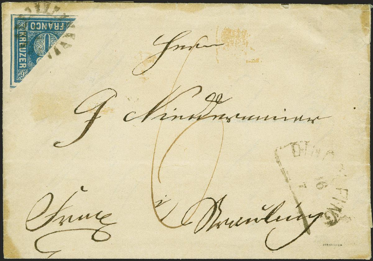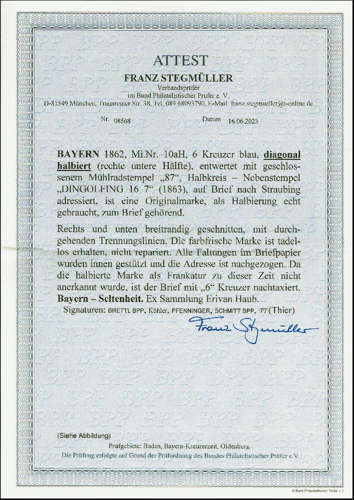| Zusatzinformationen und Suchstichworte: | 383. Auktion Heinrich Köhler 14.–15. & 18.–23. März 2024 Los 57 Altdeutschland Bayern 6 Kreuzer blau, diagonal halbiert, rechte untere Hälfte, farbfrisch und breitrandig, mit sauber aufgesetztem gMR "87" und nebengesetztem Halbkreis "DINGOLFING 16/8" (1863) auf Briefhülle (in den Faltungen getrennt bzw. gestützt) nach Straubing, hier mit "6" Kreuzern nachtaxiert. Die Adresse war radiert und ist nachgezogen, die Frankatur tadellos. Einer der wenigen Briefe, bei der die Halbierung tatsächlich beanstandet wurde. Signiert Köhler, Thier, Pfenninger und Brettl BPP, Fotoattest Stegmüller BPP (2023) Ausruf 2.000,00 EUR |