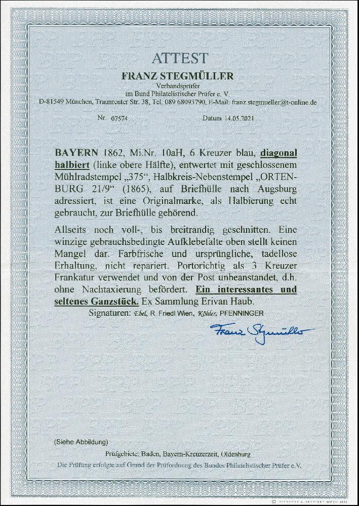 | Zusatzinformationen und Suchstichworte: | 383. Auktion Heinrich Köhler 14.–15. & 18.–23. März 2024 Los 58 Altdeutschland Bayern 6 Kreuzer blau, diagonal halbiert, linke obere Hälfte, farbfrisch, kurz noch voll- sonst breitrandig, mit sauber aufgesetztem gMR "375" und sauber nebengesetztem Halbkreis "ORTENBURG 21/9" (1865) auf Briefhülle nach Augsburg. Brieffaltungen außerhalb der Frankatur, sonst tadellose und ursprüngliche Erhaltung. Ein seltener und attraktiver Brief. Signiert Köhler, Friedl, Wien, Pfenninger und Ebel, Fotoattest Stegmüller BPP (2021) Ausruf 6.000,00 EUR |