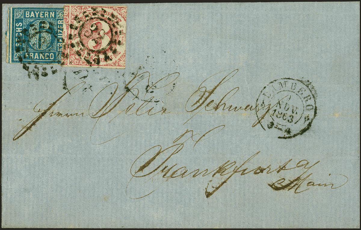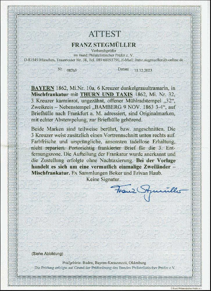 | Zusatzinformationen und Suchstichworte: | 383. Auktion Heinrich Köhler 14.–15. & 18.–23. März 2024 Los 60 Altdeutschland Thurn und Taxis 6 Kreuzer blau, in Mischfrankatur mit Thurn und Taxis 1862,3 Kreuzer karminrot, beide teils berührt bzw. angeschnitten, beide entwertet durch oMR "32", mit sauber nebengesetztem Doppelkreisstempel "BAMBERG 9 NOV 1863" auf Briefhülle nach Frankfurt/Main mit rückseitigem Distribution Stempel. Eine in dieser Kombination wahrscheinlich einmalige, unbeanstandete Mischfrankatur (Aus gleicher Korrespondenz existiert ein Brief mit Bayern 3 Kreuzer blau + Taxis 6 Kreuzer rosa). Fotoattest Stegmüller BPP (2023) Ausruf 3.000,00 EUR |