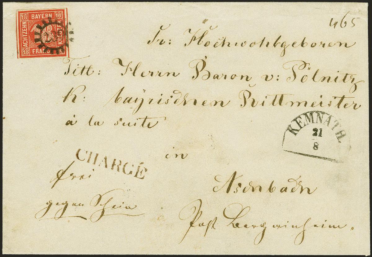 | Zusatzinformationen und Suchstichworte: | 383. Auktion Heinrich Köhler 14.–15. & 18.–23. März 2024 Los 64 Altdeutschland Bayern 18 Kreuzer zinnoberrot in besonders tiefer Farbe und voll- bis breitrandig, mit gMR "239" auf eingeschriebenem Briefkuvert der dritten Gewichtsstufe von "KEMNATH 21/8" an den Baron von Pölnitz auf Schloss Aschbach bei Burgwinheim mit handschriftlichem Vermerk "gegen Schein". Eine seltene Inlands-Einzelfrankatur in einwandfreier und attraktiver Erhaltung. Fotoattest Sem BPP (2023) Ausruf 1.000,00 EUR |