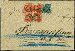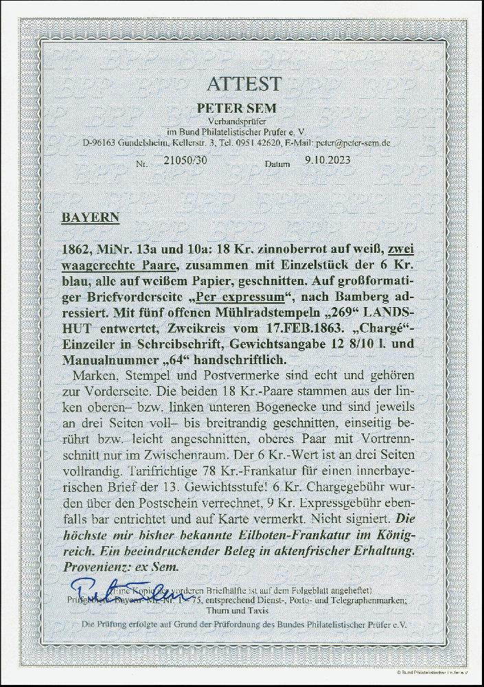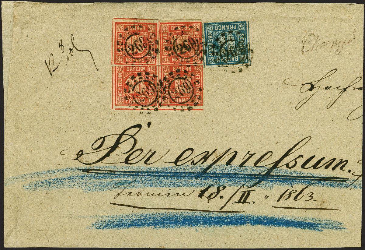 | Zusatzinformationen und Suchstichworte: | 383. Auktion Heinrich Köhler 14.–15. & 18.–23. März 2024 Los 66 Altdeutschland Bayern 18 Kreuzer zinnoberrot, 2 waagerechte Paare, zusammen mit 6 Kreuzer blau, alle farbfrisch, teils berührt bzw. angeschnitten, jedoch meist breitrandig, mit oMR "269" und sauber nebengesetztem Doppelkreisstempel "LANDSHUT 17 FEB 1863" auf Expressbrief-Vorderseite der 13. Gewichtsstufe nach Bamberg; Reco- und Expressgebühr in bar bezahlt. Ein ganz ungewöhnlicher Beleg mit der höchsten Herrn Sem bisher bekannten Eilboten-Frankatur im Königreich. Fotoattest Sem BPP (2023) Ausruf 500,00 EUR |