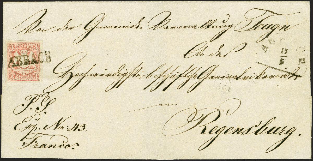 | Zusatzinformationen und Suchstichworte: | 383. Auktion Heinrich Köhler 14.–15. & 18.–23. März 2024 Los 73 Altdeutschland Bayern 3 Kreuzer rosa, farbfrisch und allseits breitrandig, mit sauber aufgesetztem Aushilfsstempel "ABBACH" und sauber nebengesetztem Halbkreis "ABBACH 17/5" auf Briefhülle nach Regensburg. Tadellos. Bisher einzig registriertes Ganzstück mit dem Aushilfsstempel. Fotoattest Sem BPP (2005) Ausruf 300,00 EUR |