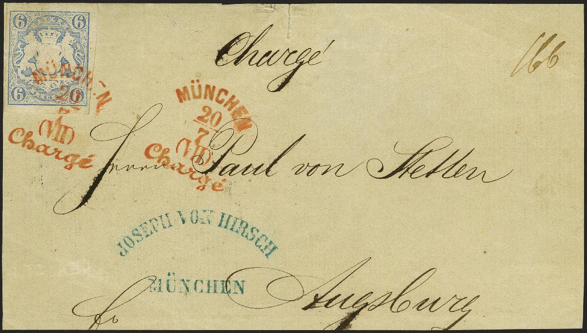 | Zusatzinformationen und Suchstichworte: | 383. Auktion Heinrich Köhler 14.–15. & 18.–23. März 2024 Los 74 Altdeutschland Bayern 6 Kreuzer blau, farbfrisch und voll- bis breitrandig, mit sauber auf- und nebengesetztem rotem 5-zeiligen Langstempel "MÜNCHEN 20/7 Chargé" auf nicht ganz kompletter Briefvorderseite nach Augsburg (oben kleiner Einriss). Der rote Stempel ist auf dieser Wertstufe sehr selten. Ein attraktives Stück in sonst einwandfreier Erhaltung. Signiert Friedl, Wien und Auktion Maier, Fotoattest Sem BPP (2023) Ausruf 500,00 EUR |