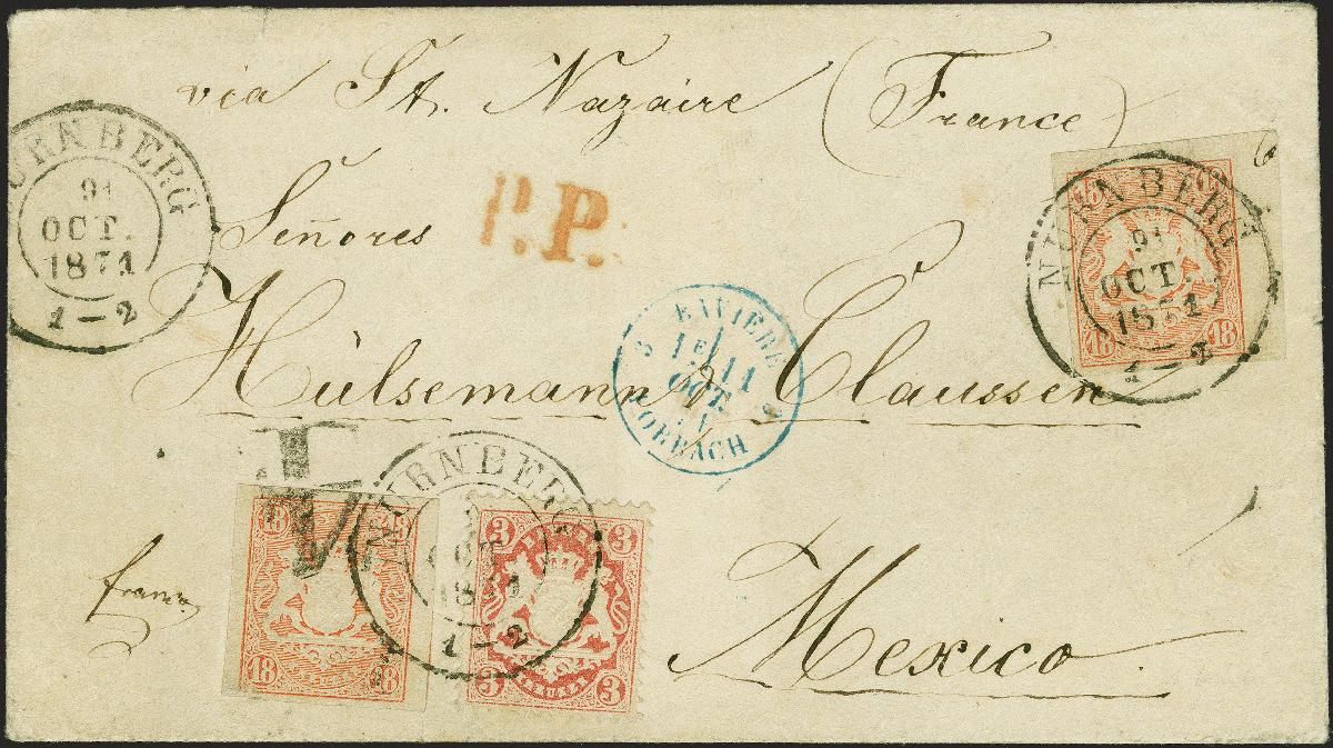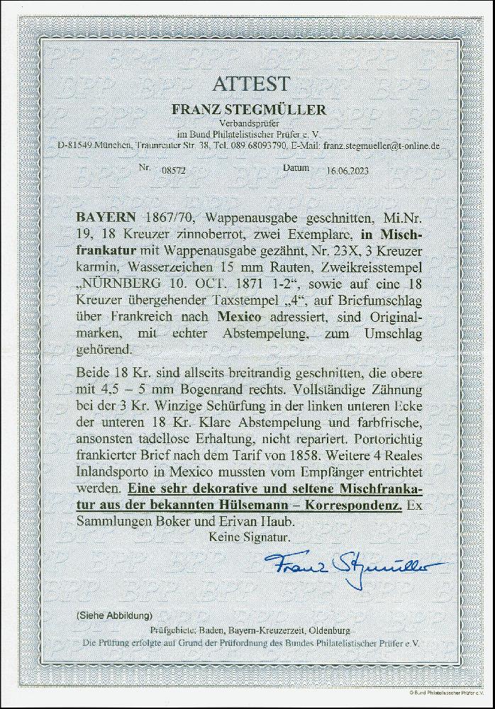 | Zusatzinformationen und Suchstichworte: | 383. Auktion Heinrich Köhler 14.–15. & 18.–23. März 2024 Los 78 Altdeutschland Bayern 1867, Wappen 18 Kreuzer ziegelrot, allseits sehr breitrandig, ein Wert mit ca. 4,5 mm Bogenrand, in Mischfrankatur mit gezähnter Ausgabe 3 Kreuzer rosa mit Wasserzeichen 'enge Rauten', mit Doppelkreisstempel "NÜRNBERG 01 OCT" (1871), auf Briefkuvert über Frankreich nach Mexiko; rückseitig französischer Schiffspoststempel "LIGNE B No. 1". Die untere 18 Kreuzer links unten kleine Schürfung, sonst einwandfreie und sehr frische Erhaltung (kleiner Teil der Verschlussklappe fehlt). Der Brief ist nach dem Tarif von 1858 portogerecht frankiert bis zum Anlandehafen, weitere 4 Reales Inlandsporto mussten vom Empfänger bezahlt werden (entsprechender Taxstempel auf der unten klebenden 18 Kreuzer). Ein attraktiver Brief nach Lateinamerika. Fotoattest Stegmüller BPP (2023) Ausruf 4.000,00 EUR |
