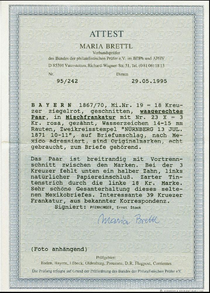| Zusatzinformationen und Suchstichworte: | 383. Auktion Heinrich Köhler 14.–15. & 18.–23. März 2024 Los 79 Altdeutschland Bayern 18 Kreuzer ziegelrot im waagerechten Paar, voll- bis breitrandig, zwischen den Marken mit längerem Vortrennschnitt, in Mischfrankatur mit gezähnter Ausgabe 3 Kreuzer rosa, mit auf- und nebengesetztem DKr. "NÜRNBERG 23 JUL. 1871" sowie zartem Tintenstrich auf einer 18 Kreuzer, auf Briefkuvert über Frankreich und London nach Mexico, mit vorderseitigem Taxtempel "4" (Reales) für das mexikanische Inlandsporto. Die 3 Kreuzer zwei kleine Zahnverkürzungen unten, ein 18 Kreuzer-Wert in der Durchsicht helle Stelle, sonst einwandfreie und für einen Überseebrief sehr frische Erhaltung. Ein bemerkenswerter Transatlantik-Brief aus der bekannten Hülsemann-Korrespondenz. Ausruf 3.000,00 EUR |