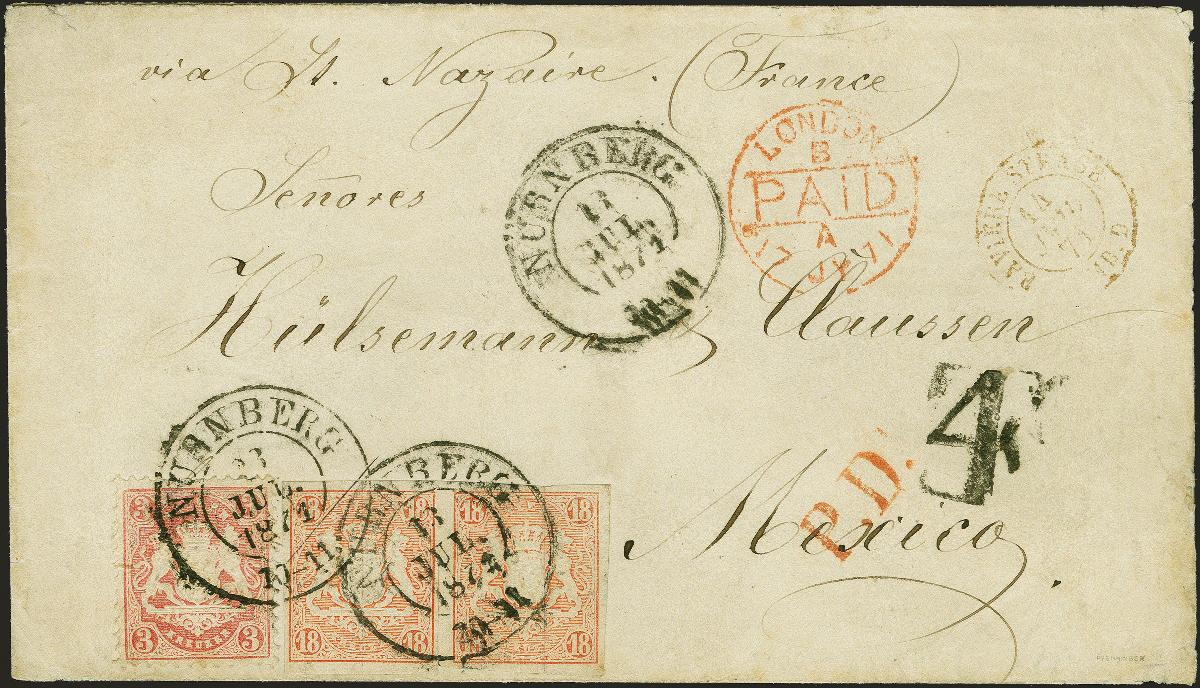 | Zusatzinformationen und Suchstichworte: | 383. Auktion Heinrich Köhler 14.–15. & 18.–23. März 2024 Los 79 Altdeutschland Bayern 18 Kreuzer ziegelrot im waagerechten Paar, voll- bis breitrandig, zwischen den Marken mit längerem Vortrennschnitt, in Mischfrankatur mit gezähnter Ausgabe 3 Kreuzer rosa, mit auf- und nebengesetztem DKr. "NÜRNBERG 23 JUL. 1871" sowie zartem Tintenstrich auf einer 18 Kreuzer, auf Briefkuvert über Frankreich und London nach Mexico, mit vorderseitigem Taxtempel "4" (Reales) für das mexikanische Inlandsporto. Die 3 Kreuzer zwei kleine Zahnverkürzungen unten, ein 18 Kreuzer-Wert in der Durchsicht helle Stelle, sonst einwandfreie und für einen Überseebrief sehr frische Erhaltung. Ein bemerkenswerter Transatlantik-Brief aus der bekannten Hülsemann-Korrespondenz. Ausruf 3.000,00 EUR |