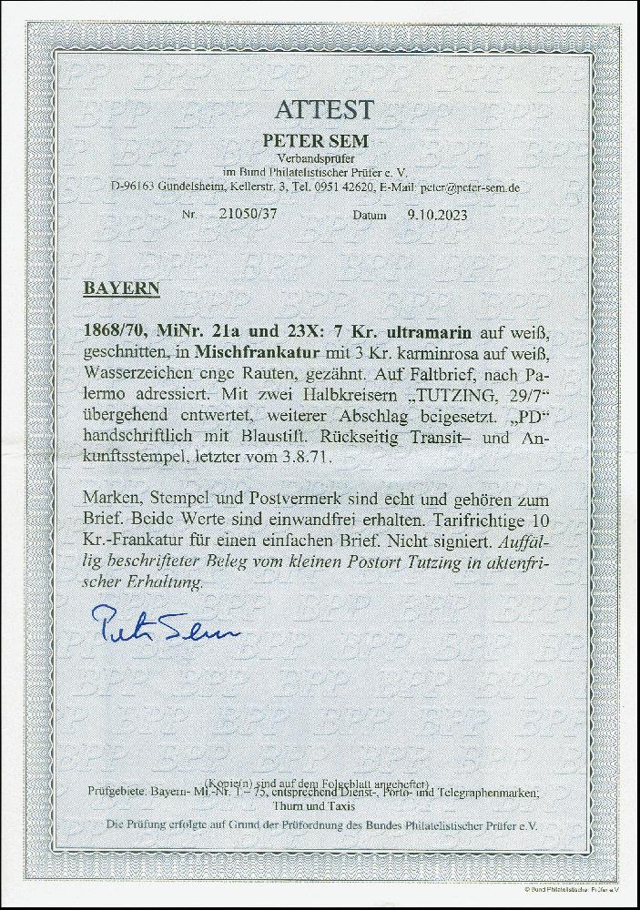 | Zusatzinformationen und Suchstichworte: | 383. Auktion Heinrich Köhler 14.–15. & 18.–23. März 2024 Los 81 Altdeutschland Bayern 7 Kreuzer ultramarin, farbfrisch und voll- bis breitrandig, in Mischfrankatur mit gezähnter Ausgabe 3 Kreuzer karminrosa, farbfrisch und gut gezähnt, mit jeweils sauber auf- und nebengesetztem Halbkreisstempel "TUTZING 29/7" (1871) auf komplettem Faltbrief an Alessandro Alliata, Principe di Villafranca in Palermo. Ein schöner Brief in frischer und einwandfreie Erhaltung. Fotoattest Sem BPP (2023) Ausruf 500,00 EUR |