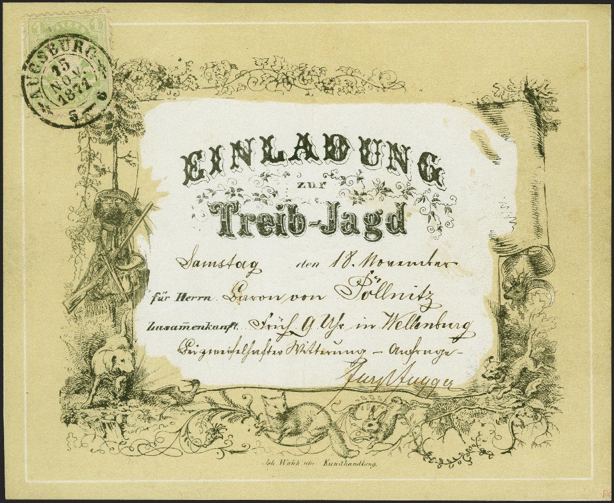 | Zusatzinformationen und Suchstichworte: | 383. Auktion Heinrich Köhler 14.–15. & 18.–23. März 2024 Los 83 Altdeutschland Bayern 7 Kreuzer ultramarin, allseits breitrandige linke untere Bogenecke, links mit 10 mm, unten mit 15 mm Bogenrand, mit Halbkreisstempel "STRAUBING 15 4" auf doppelt verwendeter Briefhülle der 2.Gewichtsstufe (innen unfrankiert) nach Mittenfels. Ein ganz außergewöhnliches Stück in einwandfreier Erhaltung. Ausruf 800,00 EUR |