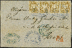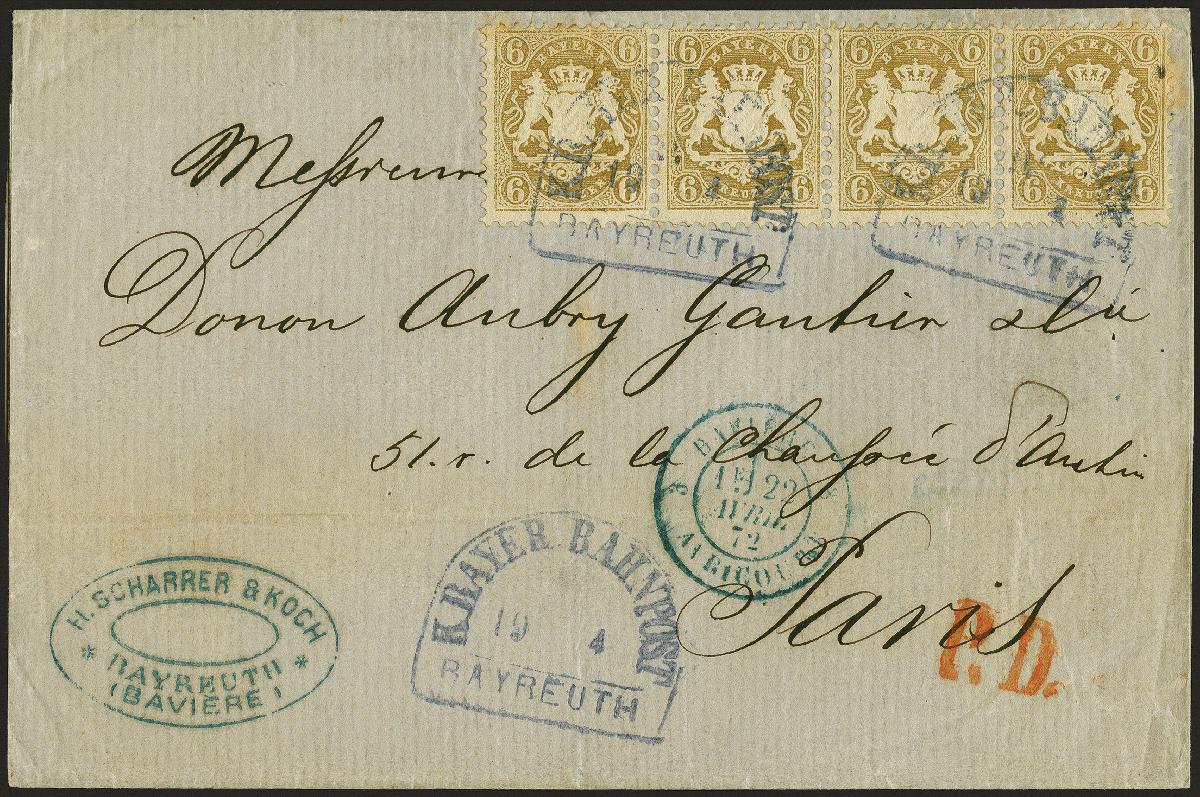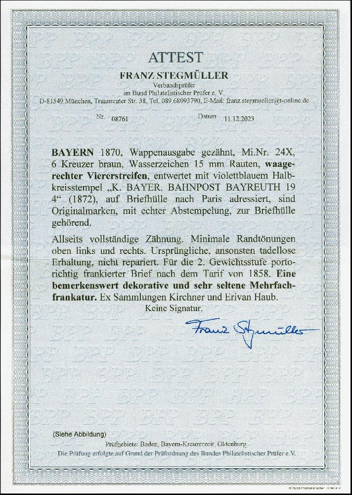 | Zusatzinformationen und Suchstichworte: | 383. Auktion Heinrich Köhler 14.–15. & 18.–23. März 2024 Los 84 Altdeutschland Bayern 6 Kreuzer braun, waagrechter Viererstreifen, farbfrisch und einwandfrei gezähnt, mit sauber auf- und nebengesetztem violettblauem Halbkreisstempel "K. BAYER. BAHNPOST BAYREUTH 19 4" (1872) auf Briefhülle der 2.Gewichtsstufe nach Paris. Der Streifen an 2 Stellen minimale Randtönungen, sonst tadellose, ursprüngliche Erhaltung. Größte registrierte Einheit dieser Marke mit Poststempelentwertung; wir haben keine weitere derartige registriert. Fotoattest Stegmüller BPP (2023) Ausruf 2.000,00 EUR |