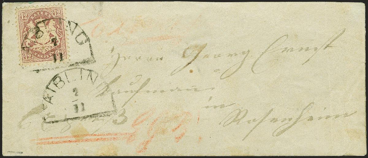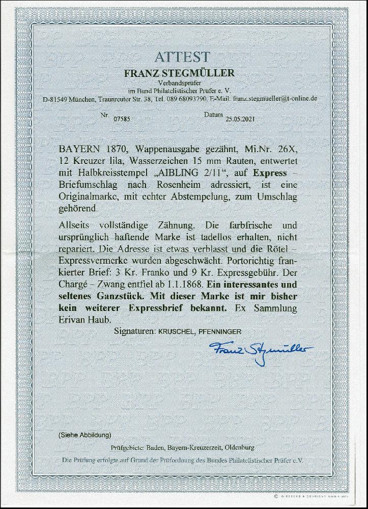 | Zusatzinformationen und Suchstichworte: | 383. Auktion Heinrich Köhler 14.–15. & 18.–23. März 2024 Los 85 Altdeutschland Bayern 12 Kreuzer lila, farbfrisch und einwandfrei gezähnt, mit sauber auf- und nebengesetztem Halbkreisstempel "AIBLING 2/11" auf kleinem Briefkuvert per Express nach Rosenheim mit Ankunftsstempel vom selben Tag. Die Adresse ist etwas verblasst, die Rötel-Expressvermerke abgeschwächt und das Kuvert leichte Beförderungspuren, sonst einwandfrei. Der Brief ist portogerecht frankiert mit 3 Kreuzern Briefgebühr und 6 Kreuzern Expressgebühr (der Chargé-Zwang entfiel ab dem 1.1.1868) Eine in dieser Form außerordentlich seltene Einzelfrankatur dieser Marke; wir haben nur einen ähnlichen Beleg registriert. Signiert Pfenninger und Kruschel, Fotoattest Stegmüller BPP (2021) Ausruf 2.000,00 EUR |