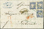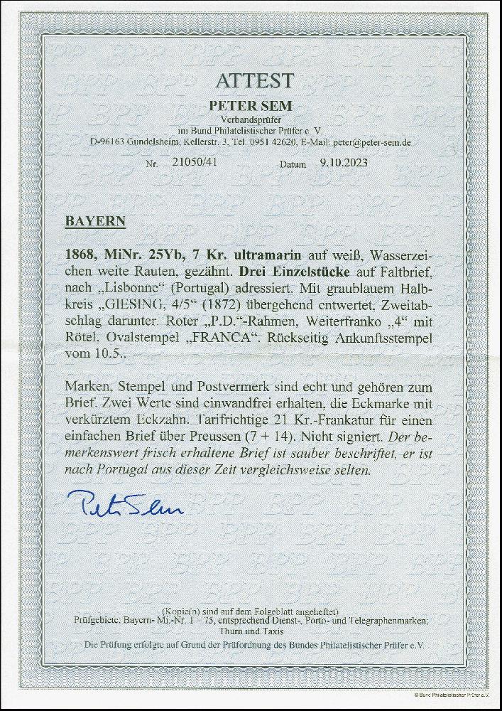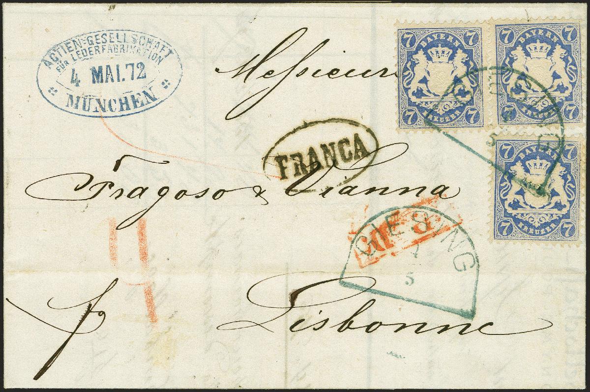 | Zusatzinformationen und Suchstichworte: | 383. Auktion Heinrich Köhler 14.–15. & 18.–23. März 2024 Los 86 Altdeutschland Bayern 7 Kreuzer ultramarin, 3 Einzelwerte, farbfrisch und bis auf einen verkürzten Eckzahn gut gezähnt, mit sauber auf- und nebengesetztem graublauen Segmentstempel "GIESING 4 5" (1872) auf komplettem Faltbrief nach Lissabon, mit ovalem Transitstempel "FRANCA" und rückseitigem Ankunftsstempel. Das Porto betrug bis 30.6.1872 21 Kreuzer pro 10 g, davon 7 Kreuzer Vereinstaxe + 14 Kreuzer Weiterfranko, hier notiert als "4" Silbergroschen. Ein attraktiver und seltener Auslandsbrief, mit dem blauen Stempel von Giesing ein Liebhaberstück. Fotoattest Sem BPP (2023) Ausruf 1.000,00 EUR |