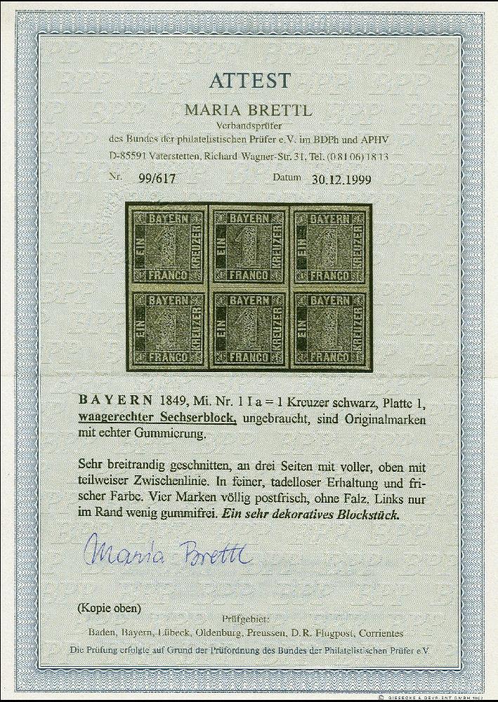 | Zusatzinformationen und Suchstichworte: | 383. Auktion Heinrich Köhler 14.–15. & 18.–23. März 2024 Los 3678 Altdeutschland Bayern 1 Kr. schwarz, waagerechter 6er-Block, farbfrisch und allseits breitrandig, mit fast allen Zwischenlinien, ungebraucht, 4 Werte postfrisch. Eine seltene Einheit in tadelloser Erhaltung. Unsigniert, Fotoattest Brettl BPP (1999) Ausruf 4.000,00 EUR |