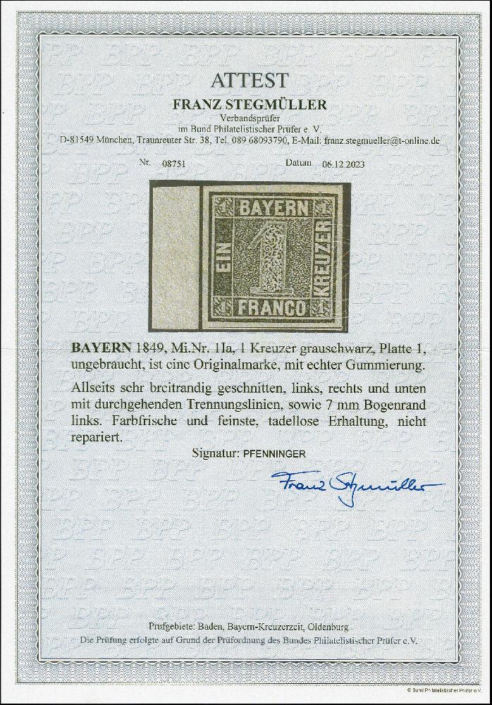 | Zusatzinformationen und Suchstichworte: | 383. Auktion Heinrich Köhler 14.–15. & 18.–23. März 2024 Los 3680 Altdeutschland Bayern 1 Kr. grauschwarz, Platte 1, farbfrisch und allseits breitrandig mit 7mm Bogenrand links, rechts und unten mit durchgehenden Trennungslinien, ungebraucht mit Originalgummi, tadellos, sign. Pfenninger sowie Fotoattest Stegmüller BPP (2023) Ausruf 250,00 EUR |