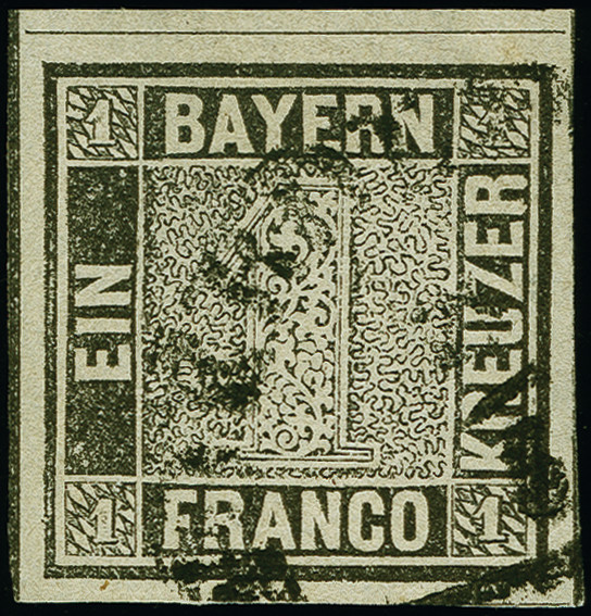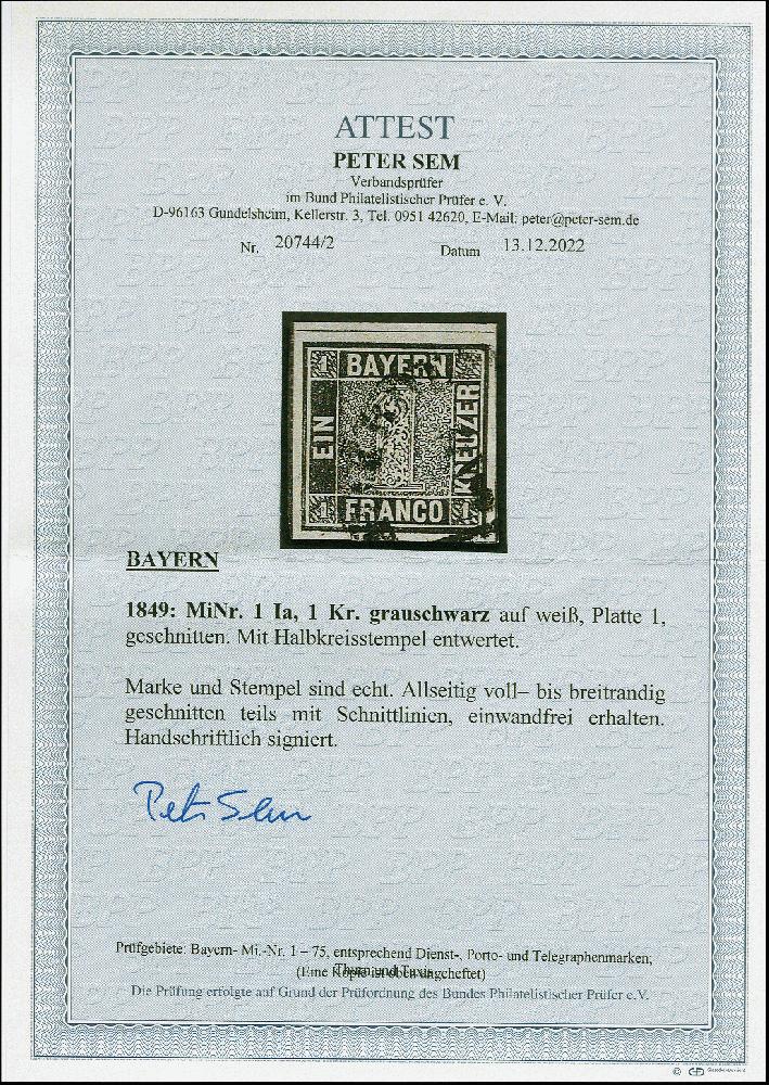 | Zusatzinformationen und Suchstichworte: | 383. Auktion Heinrich Köhler 14.–15. & 18.–23. März 2024 Los 3684 Altdeutschland Bayern 1 Kr. grauschwarz, allseits breit- bis überrandig, allseitig mit zumindest Teilen der Zwischenlinien, mit leicht aufgesetztem Halbkreisstempel. Tadellos. Fotoattest Sem BPP (2022 Ausruf 1.000,00 EUR |