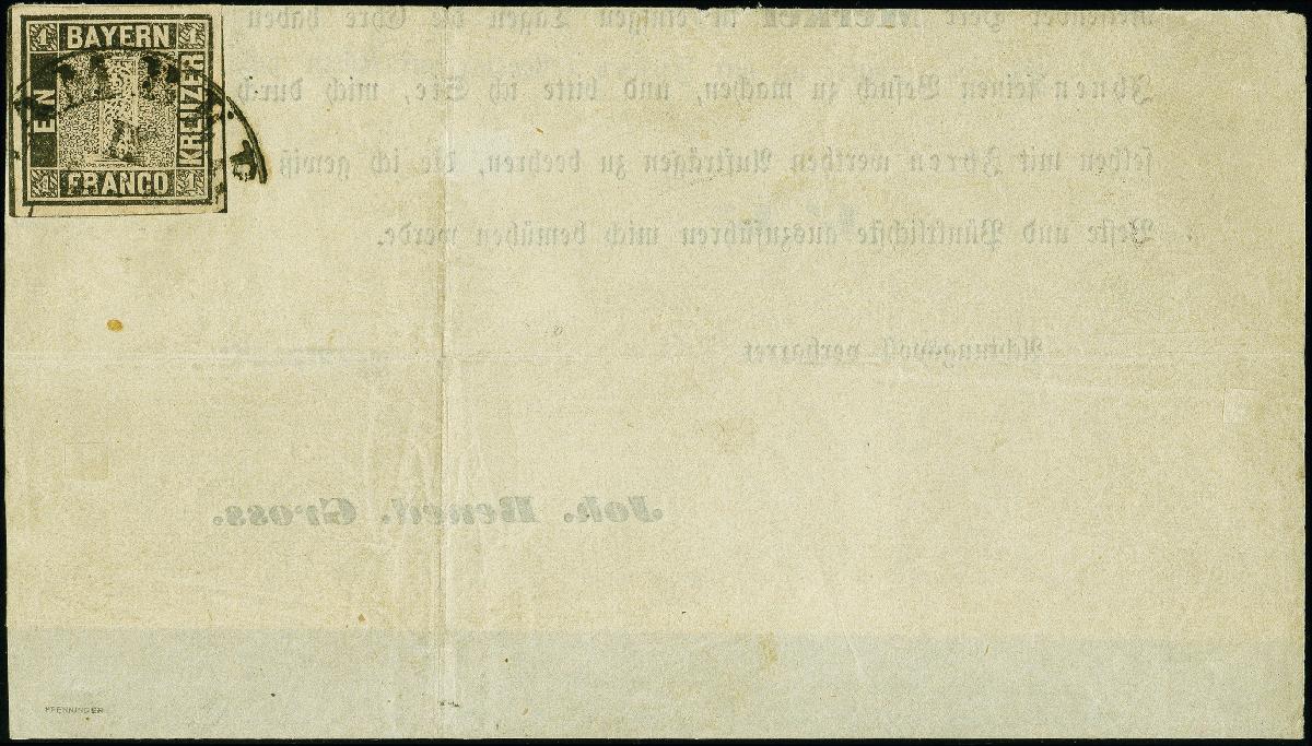 | Zusatzinformationen und Suchstichworte: | 383. Auktion Heinrich Köhler 14.–15. & 18.–23. März 2024 Los 3688 Altdeutschland Bayern 1 Kr. schwarz, Platte 1, farbfrisch und allseits breitrandig, mit Halbkreisstempel von Bamberg auf kompletter Drucksache (Vertreter Ankündigung) ohne Adressschleife. Faltungen außerhalb der Frankatur, sonst tadellos. Ausruf 1.500,00 EUR |